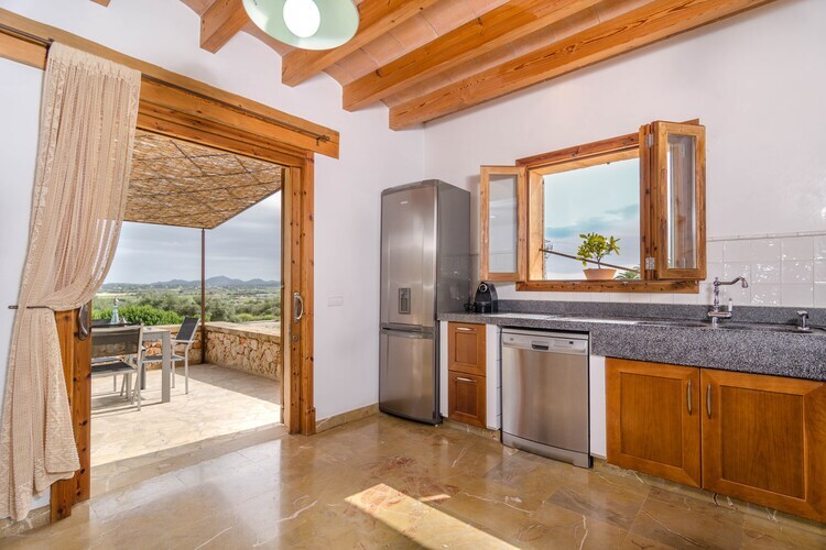 El interior de la casa combina el estilo mallorquÃn tradicional con una decoración moderna. Cuenta con estancias luminosas y detalles únicos cómo la pared de piedras en el comedor. Desde allÃ, tienen acceso a la cocina de inducción y totalmente equipada para que puedan preparar un banquete si desean. El salón es un espacio cómodo para leer o ver la televisión por satélite. Delante de la cocina se encuentra la lavanderÃa, equipada con una lavadora, una secadora, una aspiradora, una plancha y una tabla de planchar. Respecto a los tres dormitorios, todos disponen de AC y se localizan en la primera planta, dos de ellos tienen cama de matrimonio y uno tiene dos camas individuales. Un dormitorio con cama doble ofrece un baño en-suite con ducha. Aparte de esto, hay un baño con ducha en la planta baja y uno con bañera en la planta de arriba.