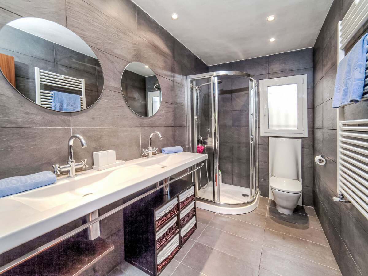 À l'étage supérieur: 1 chambre avec 1 grand-lit (160 cm, longueur 190 cm), douche/bidet/WC.