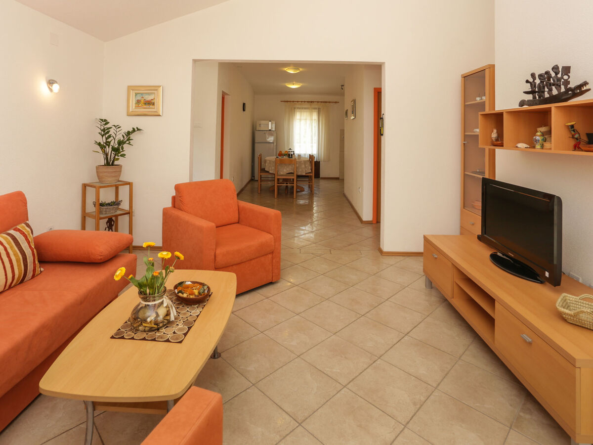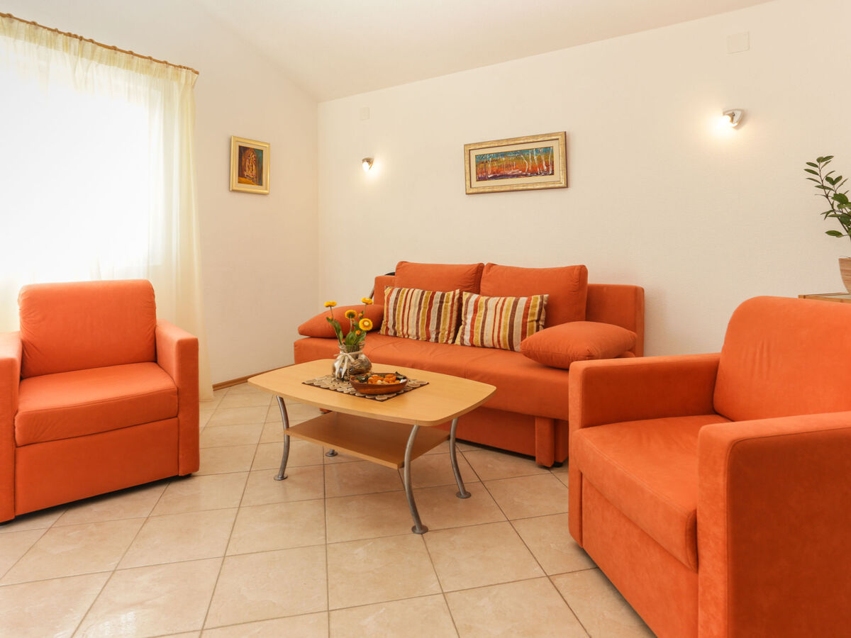 À l'étage supérieur: (escalier extérieur) séjour/salle à manger avec 1 divan-lit (140 cm, longueur 200 cm), TV (satellite) (écran plat), air-conditionné.