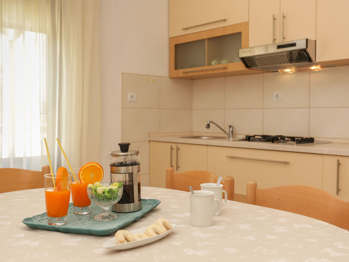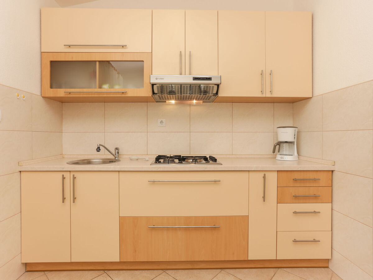 Cuisine ouverte (4 plaques de cuisson, four, lave-vaisselle, congélateur) avec air-conditionné.