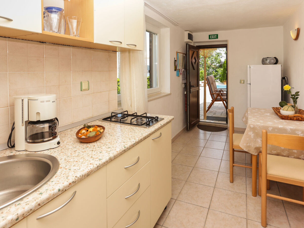 Cuisine (2 plaques de cuisson, congélateur) avec table pour les repas.