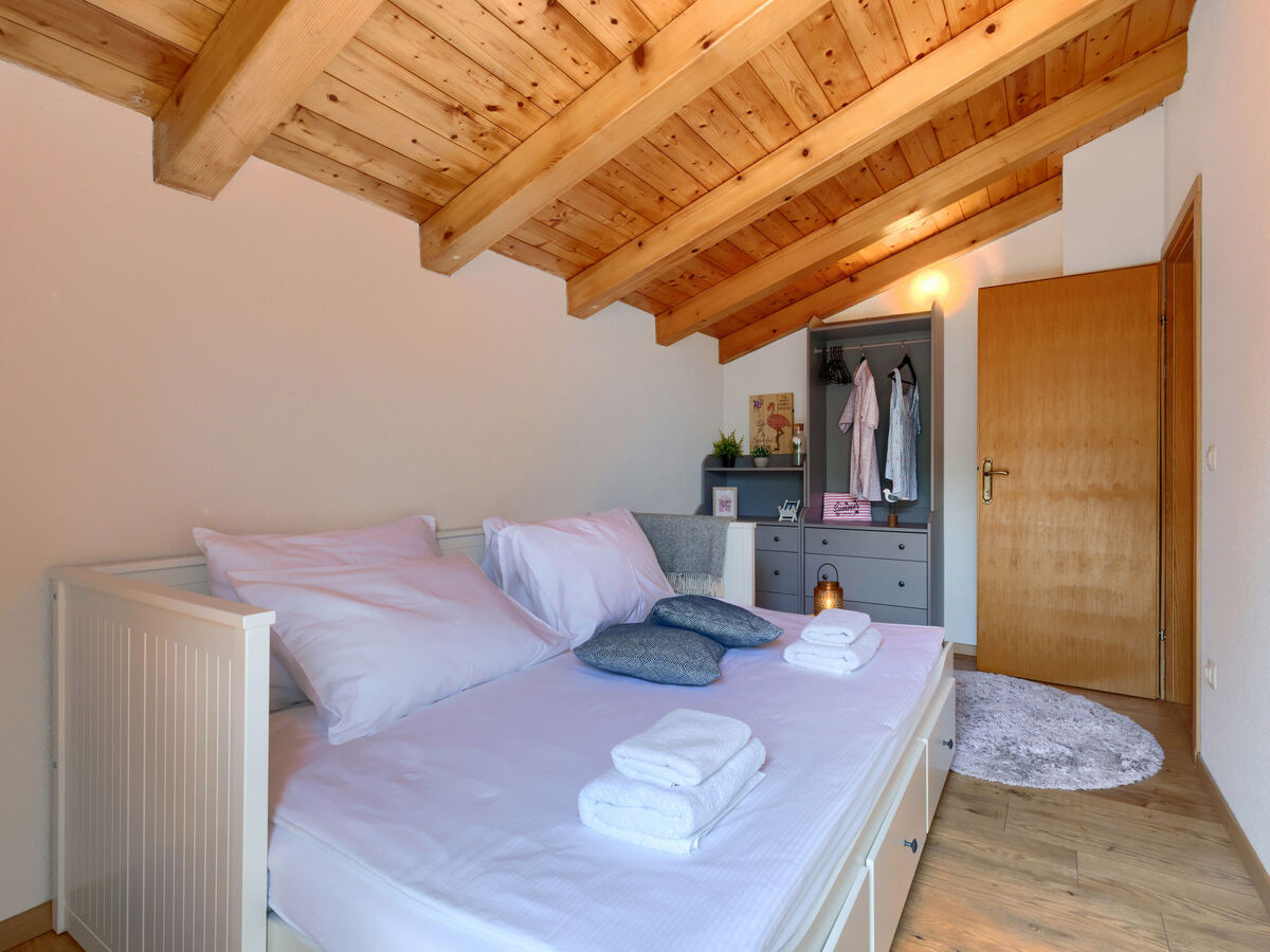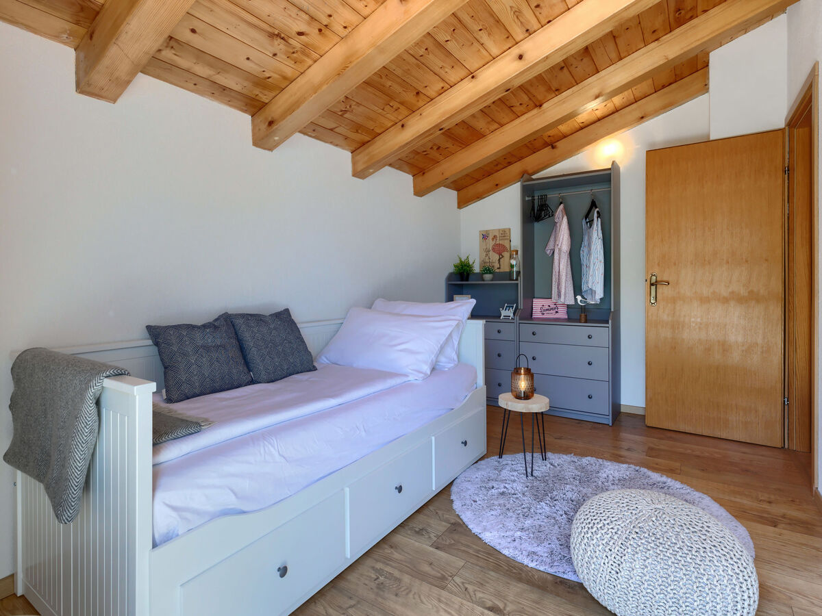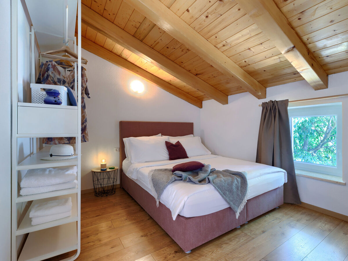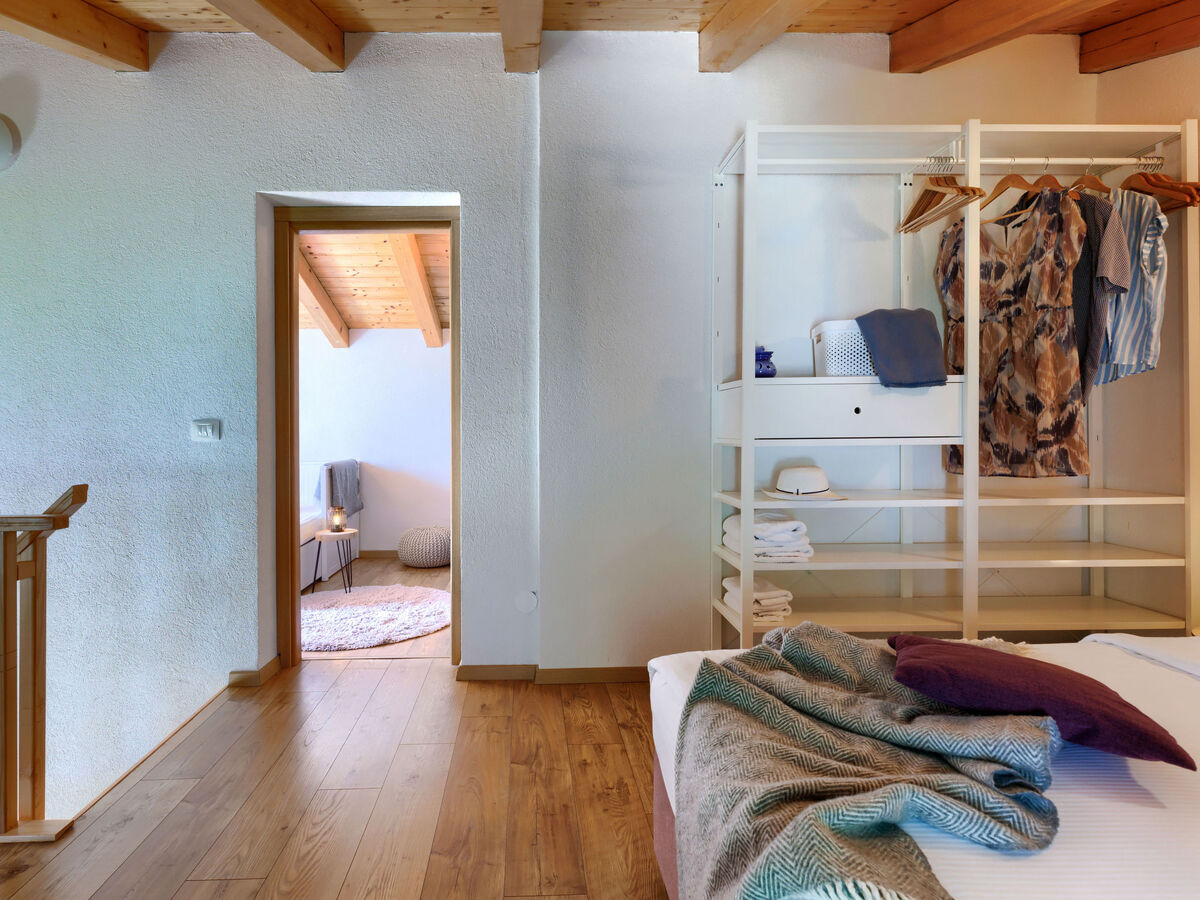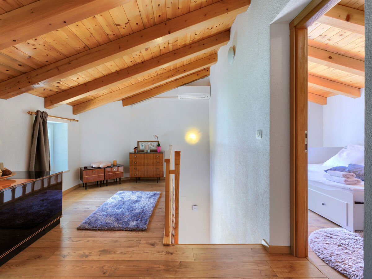 À l'étage supérieur: chambre avec passage avec 1 grand-lit (160 cm, longueur 200 cm), air-conditionné.