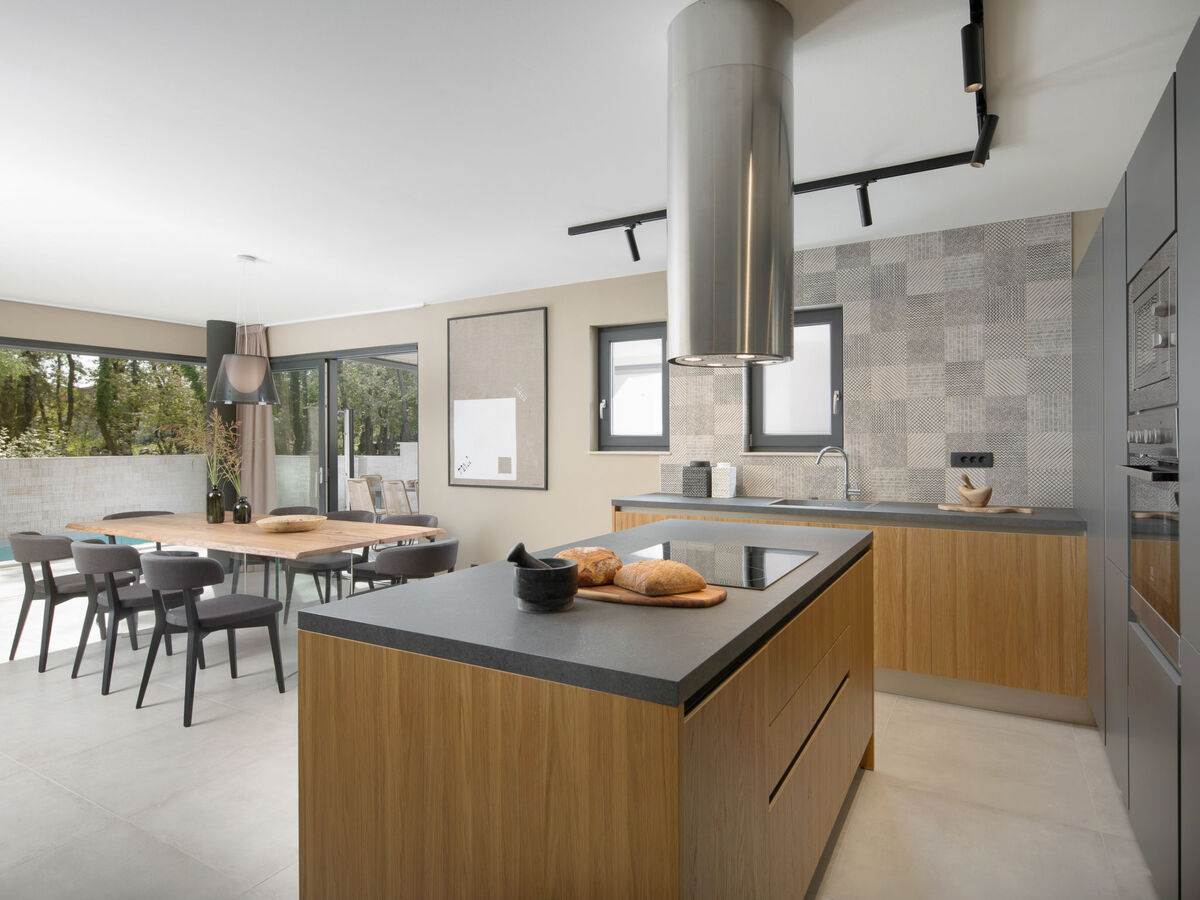 Cuisine ouverte (four, lave-vaisselle, 4 plaques vitrocéramiques, micro-ondes, congélateur, cafetière électrique) avec air-conditionné.