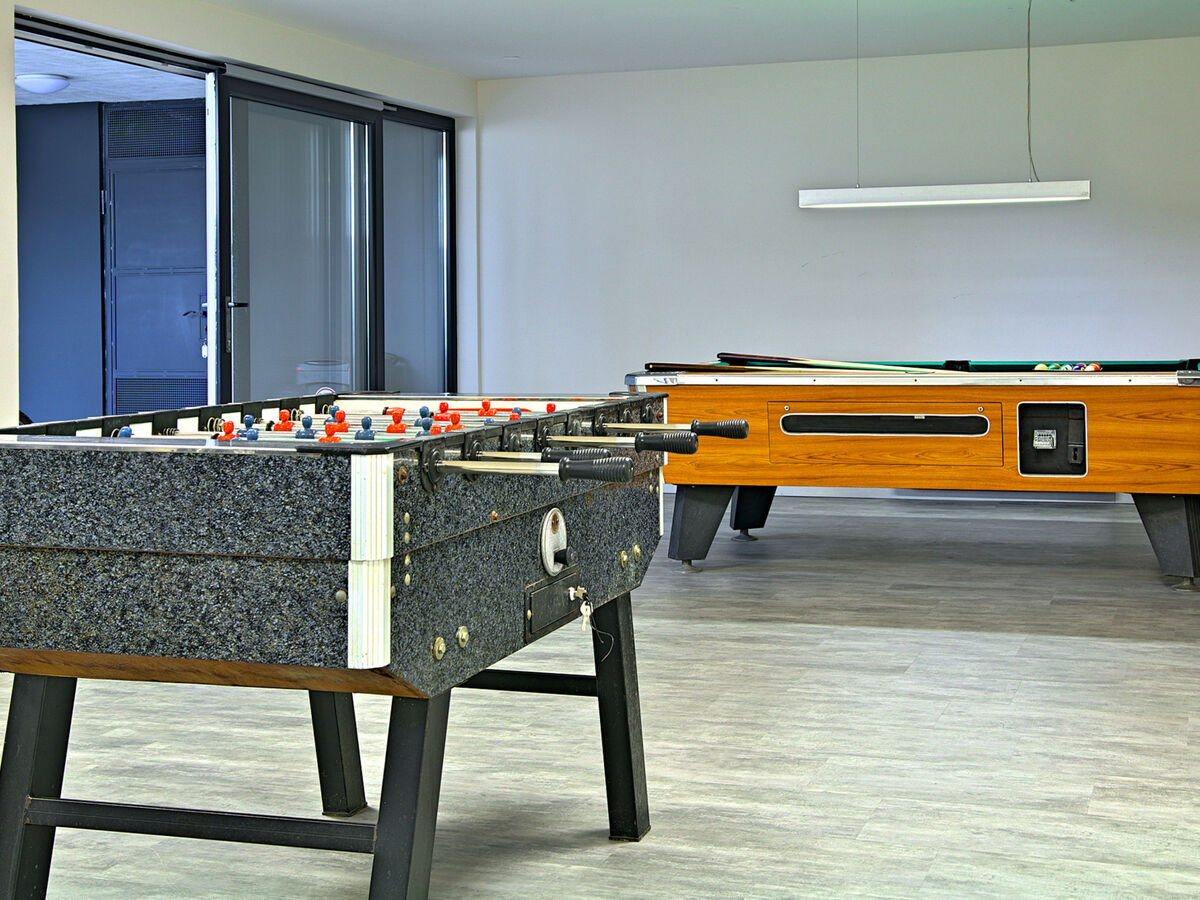 Au rez-de-chaussée : billard, jeu de fléchettes, baby-foot, climatisation.