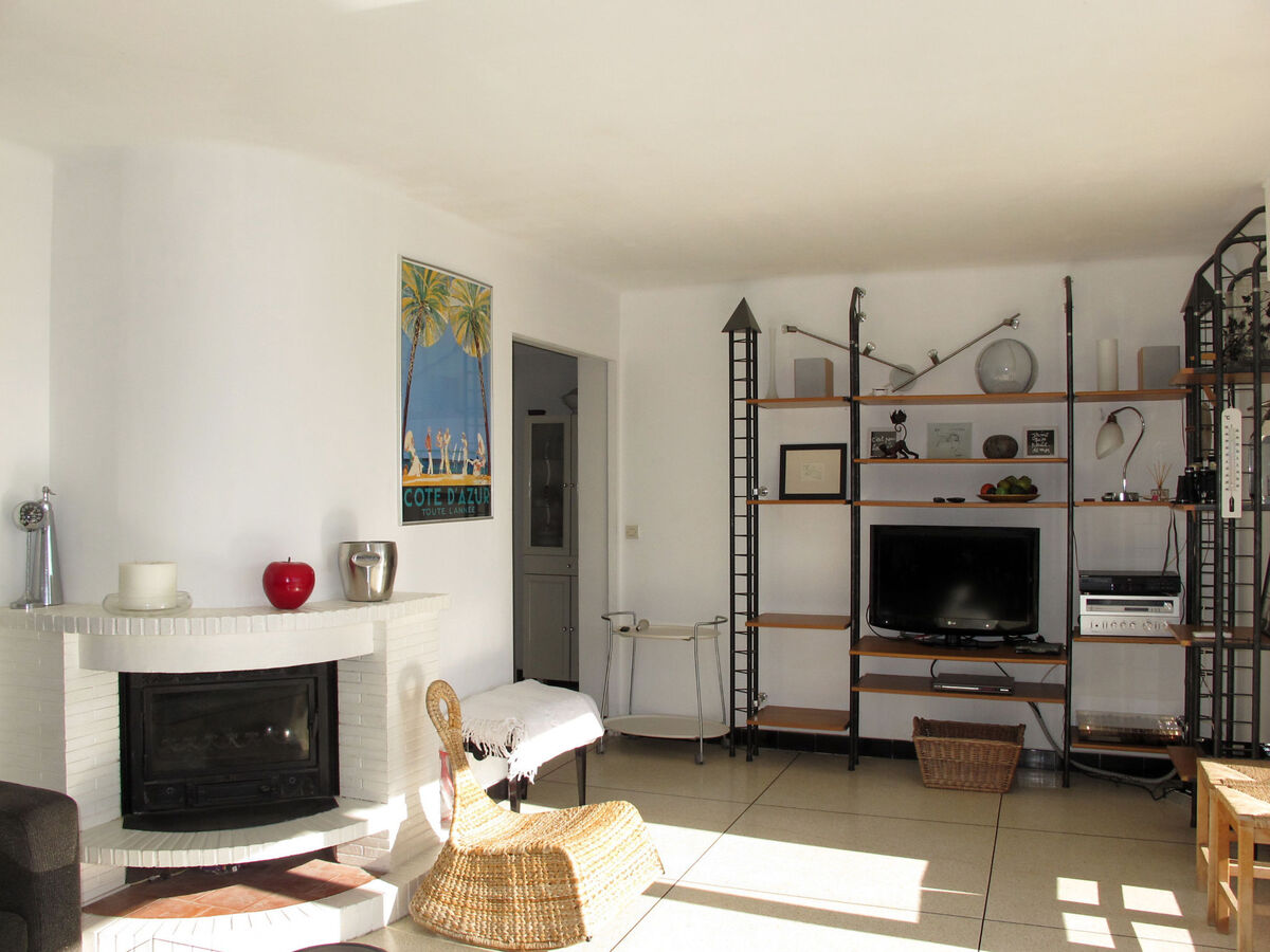 Aménagement confortable: à l'étage supérieur: (escalier extérieur) séjour avec cheminée (uniquement à titre de décoration), TV (satellite), chaîne stéréo et DVD.