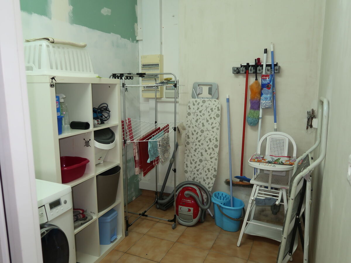 A disposition: lave-linge, chaise haute pour enfant, lit bébé.