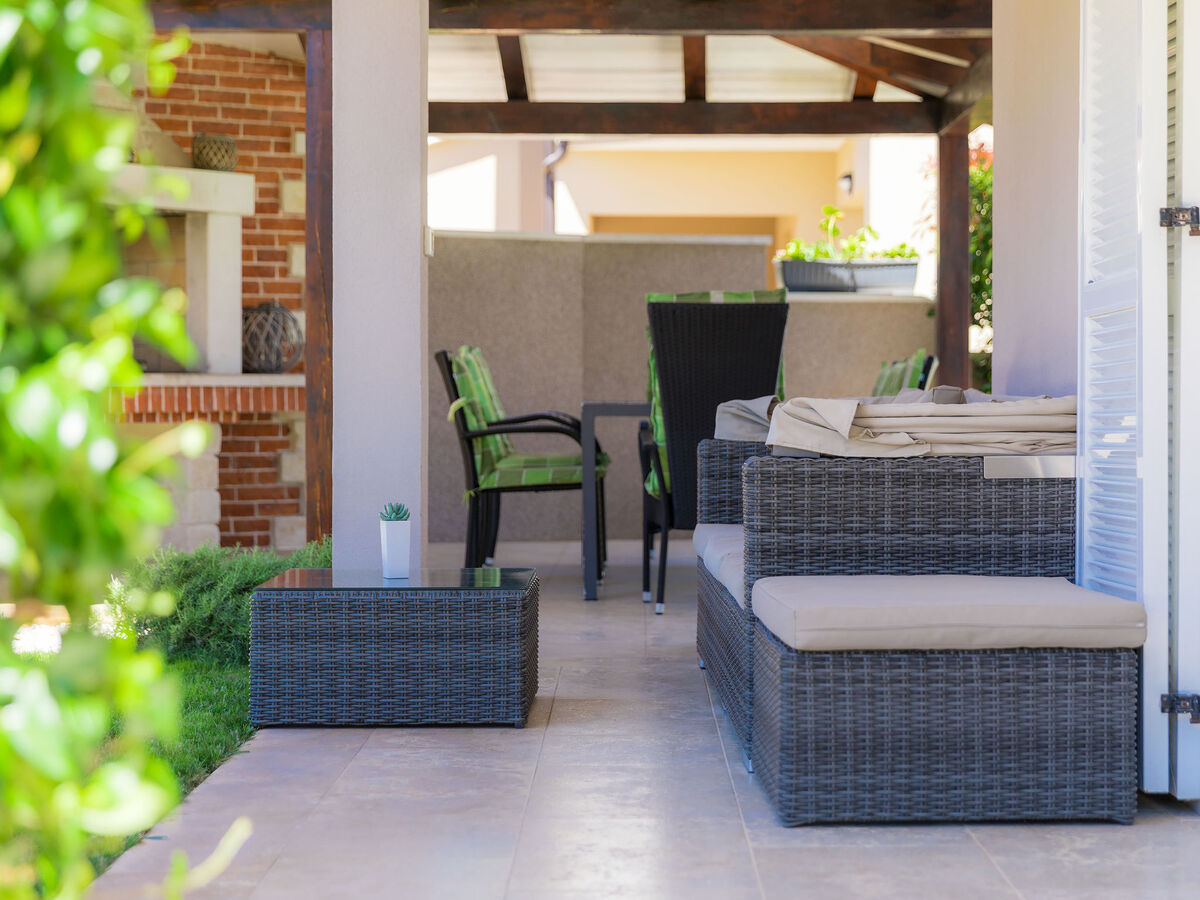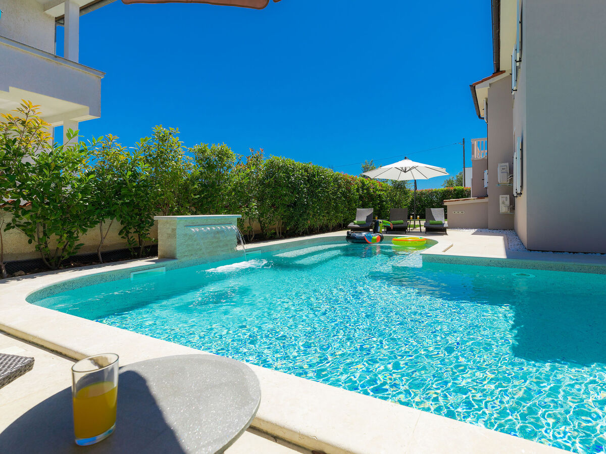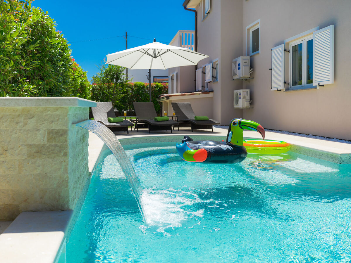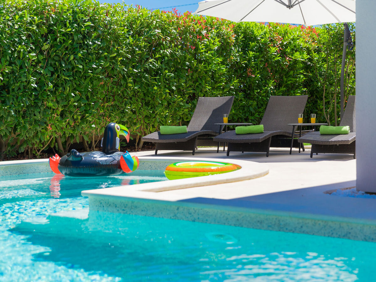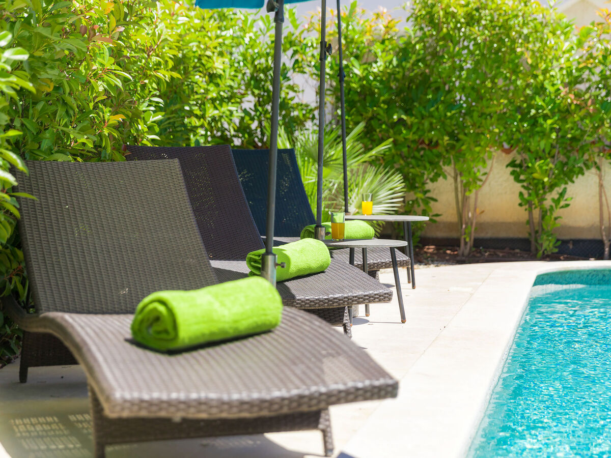 A usage privé: terrain 400 m2 (clôturé), petit jardin avec pelouse et plantes, piscine (32 m2, profondeur 135 cm, disponibilité saisonnière: 02.Mai.