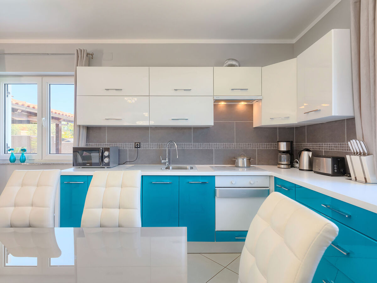 Cuisine ouverte (four, lave-vaisselle, 4 plaques vitrocéramiques, micro-ondes, congélateur, cafetière électrique).