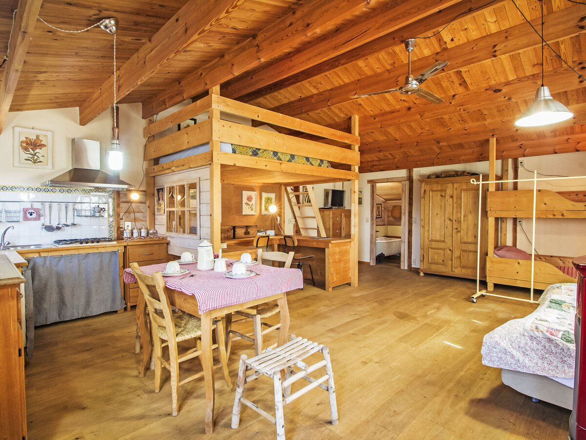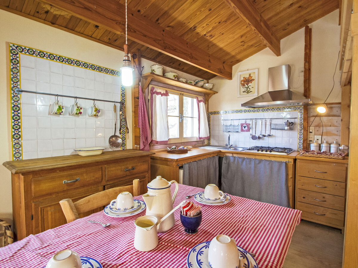 Cuisine/séjour (5 plaques de cuisson, four, lave-vaisselle, micro-ondes, congélateur) avec cheminée, table pour les repas et TV (écran plat), poêle à bois.