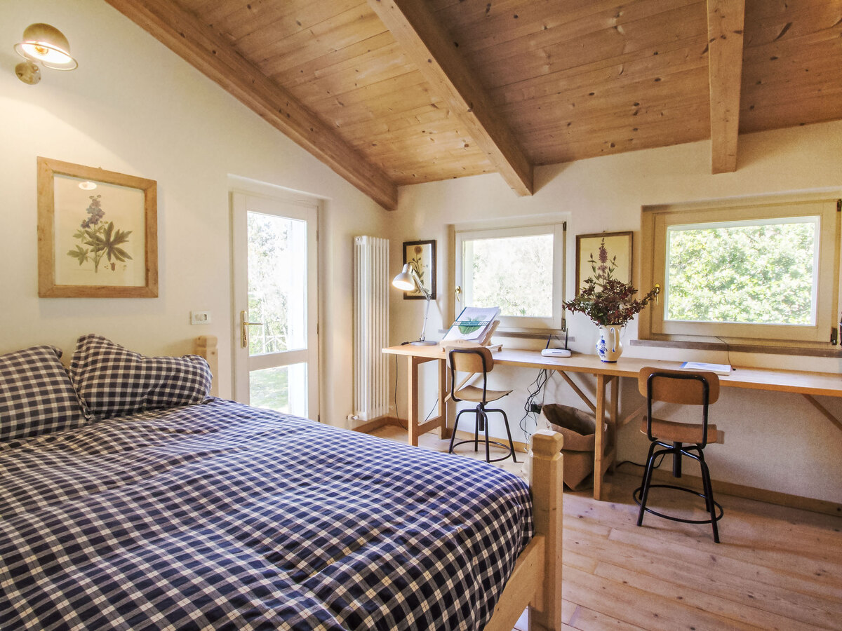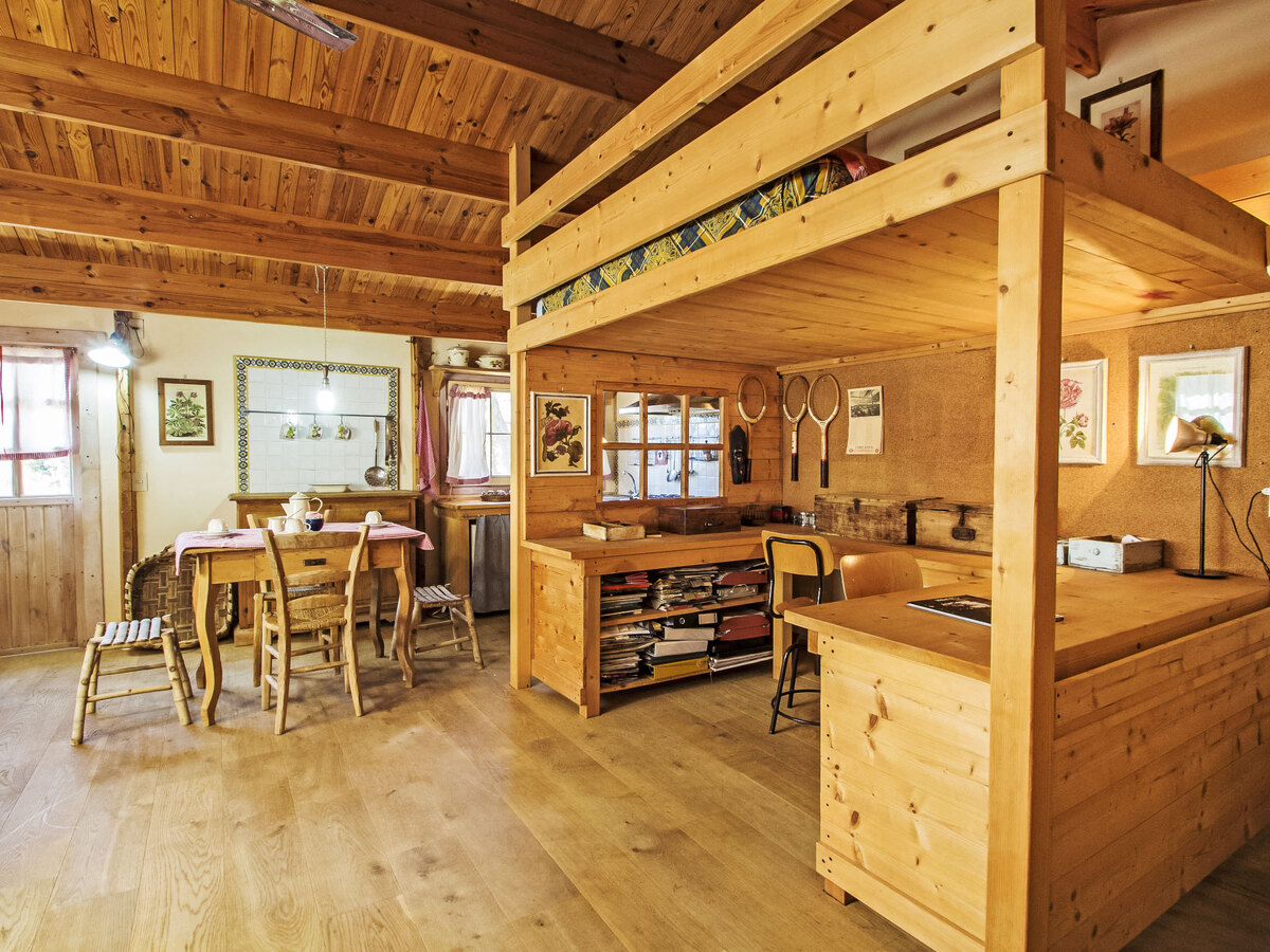 Le salon avec lit double en mezzanine, lit superposé, kitchenette et salle de bain, est situé dans la belle et accueillante annexe du jardin, située à quelques mètres de la piscine.