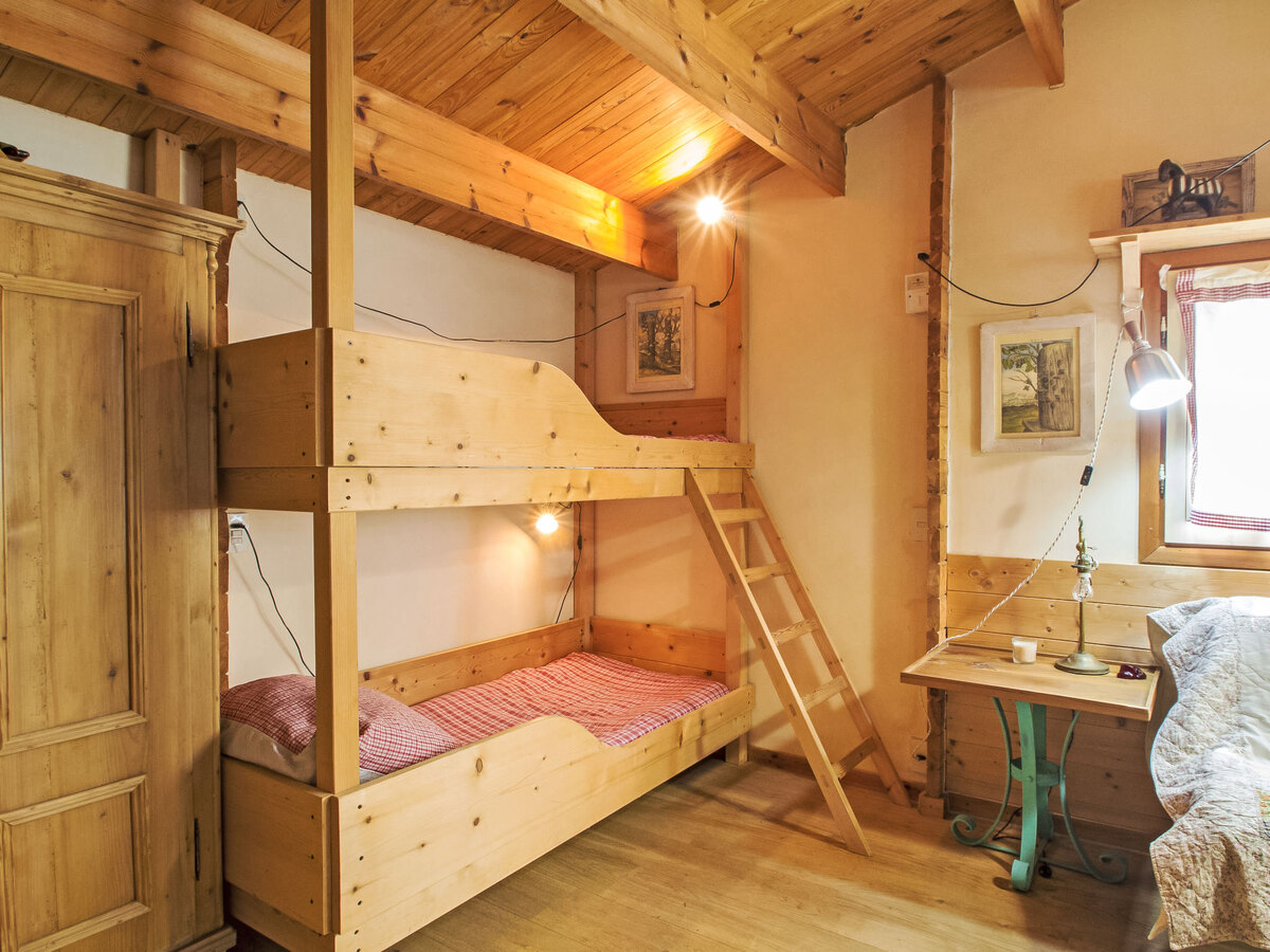 Séjour/chambre à coucher avec 1 x 2 lits superposés, 1 lit double, coin-cuisine, bain/bidet/WC, radiateur et air-conditionné.