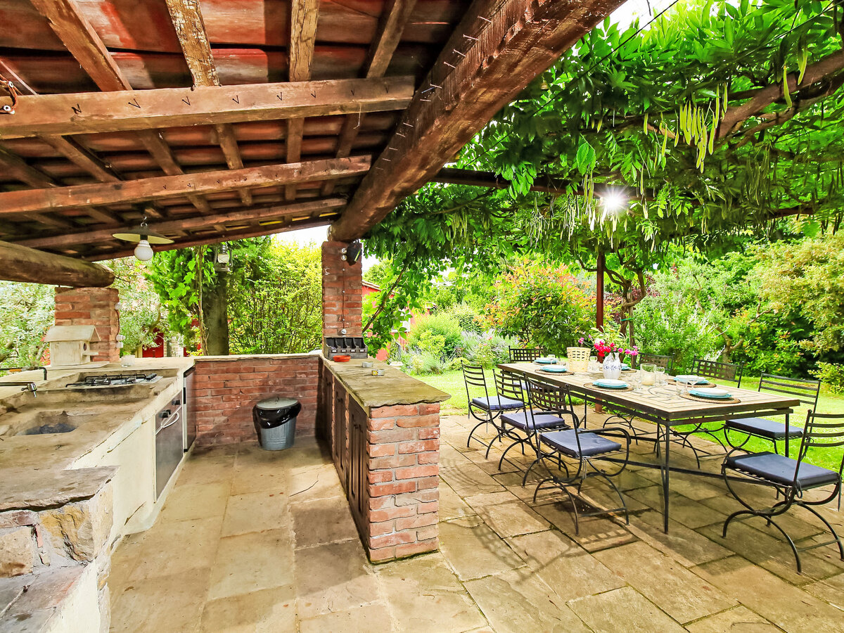 À l'intérieur du parc sous la pergola il y a un espace barbecue avec un réfrigérateur, un four à bois, un four, une cuisinière à gaz et une grande table à manger.