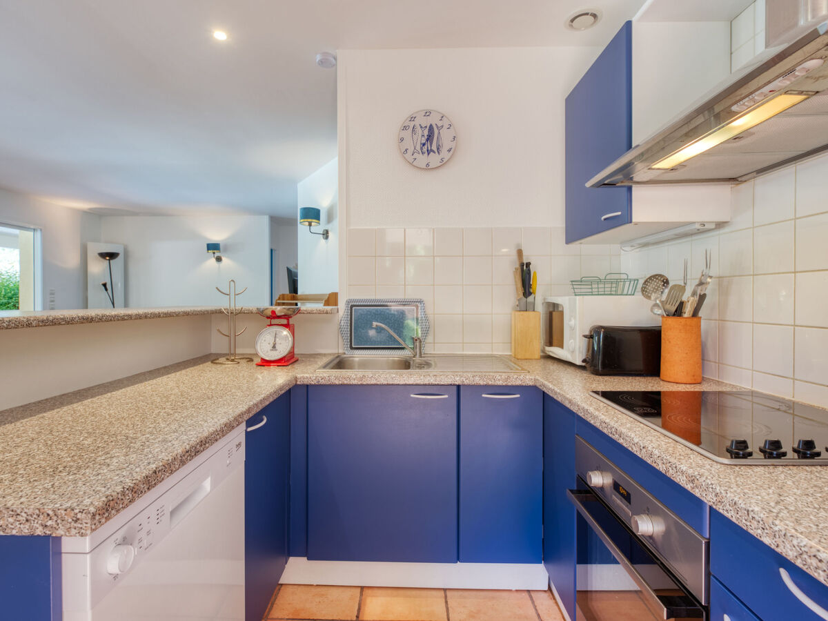 Cuisine ouverte (four, lave-vaisselle, 4 plaques vitrocéramiques, grille-pain, bouilloire électrique, micro-ondes, cafetière électrique).
