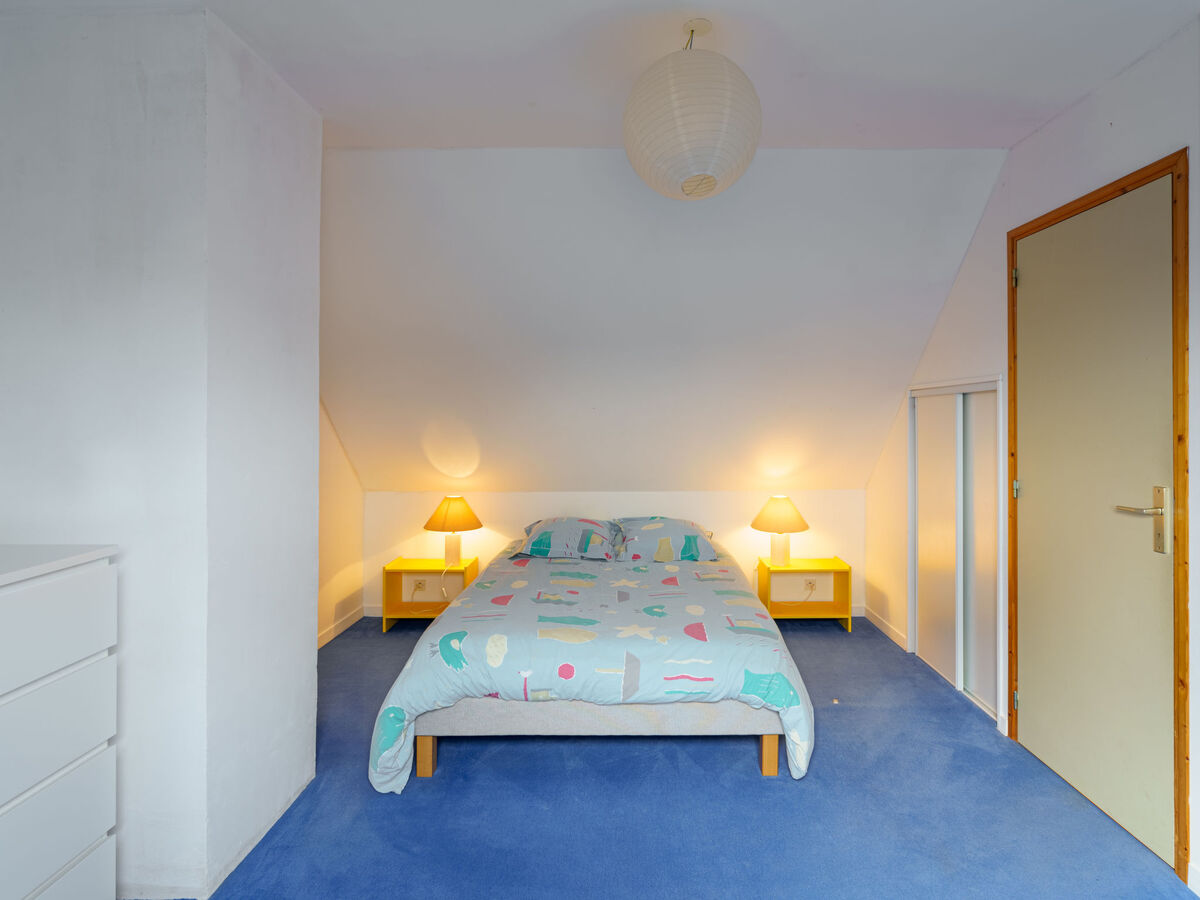 À l'étage supérieur: 1 chambre avec 1 lit (90 cm, longueur 190 cm), 1 grand-lit (140 cm, longueur 190 cm).
