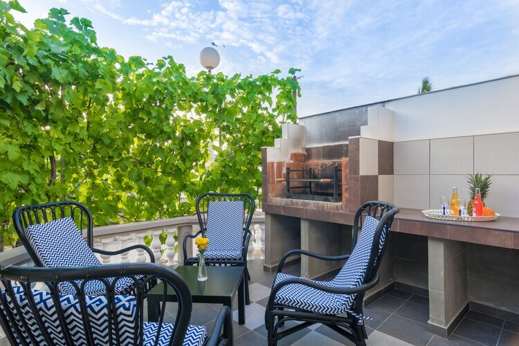 Au 1er étage: (cuisine(TV(écran plat, satellite), table(6 personnes), bouilloire, cuisinière, cafetière/percolateur, four, micro ondes, combinaison réfrigérateur/congélateur), chambre(lit double), chambre(lit double), chambre(lit double), salle de bains(douche, lavabo, WC), balcon, terrasse sur le toit) balcon, patio, climatisation, mobilier de jardin, barbecue, parking