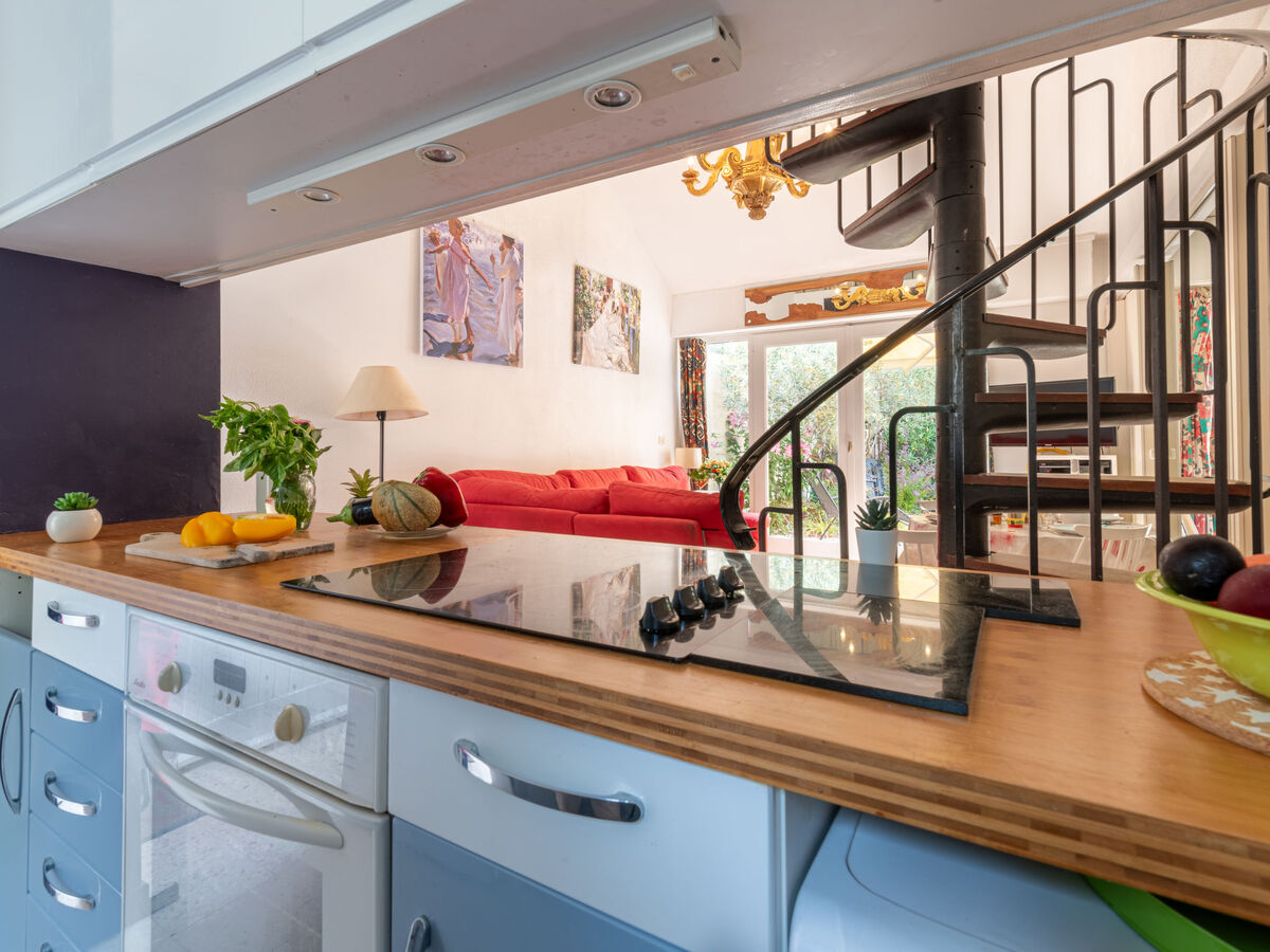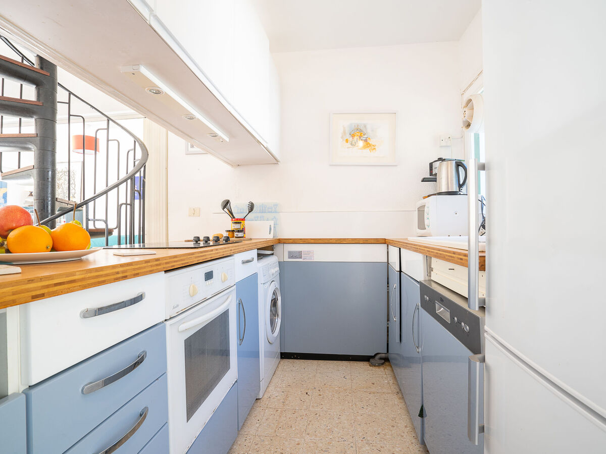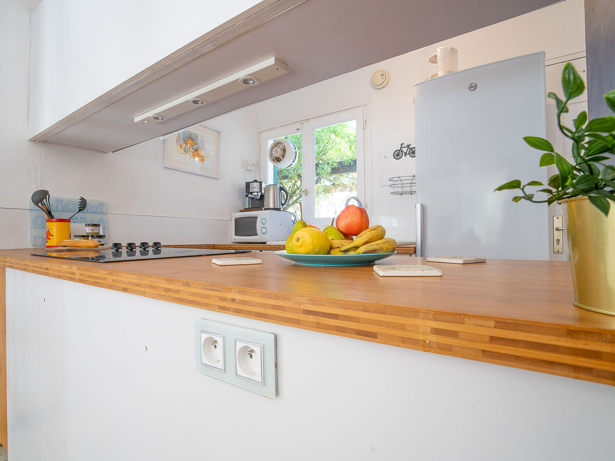 Cuisine ouverte (four, lave-vaisselle, 4 plaques vitrocéramiques, grille-pain, bouilloire électrique, micro-ondes, cafetière électrique).