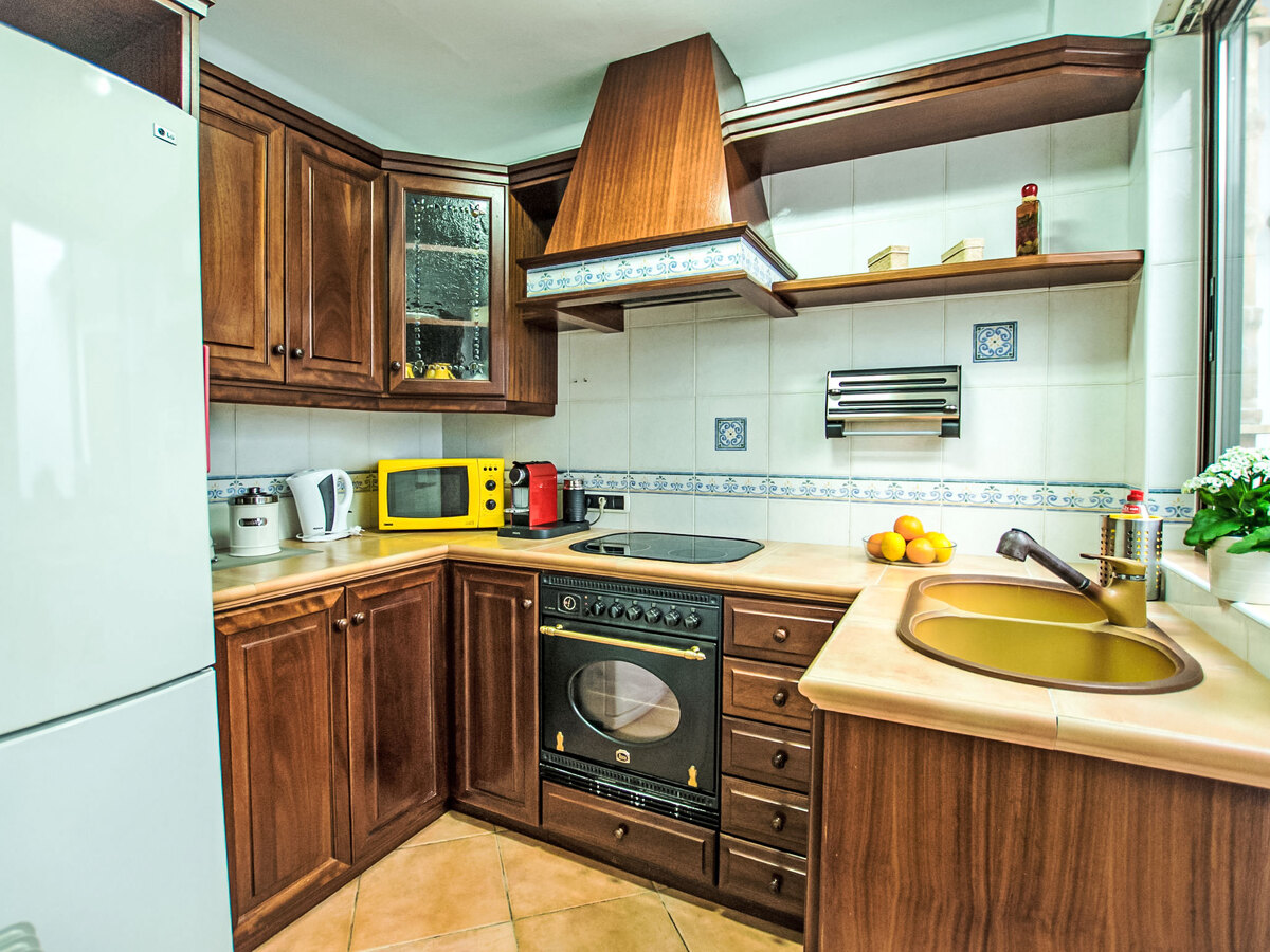 Cuisine ouverte (four, 4 plaques vitrocéramiques, grille-pain, bouilloire électrique, micro-ondes, congélateur, cafetière électrique).