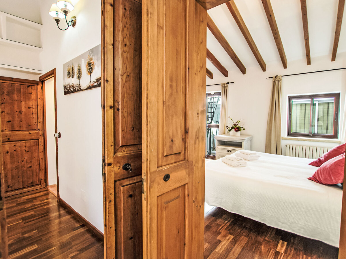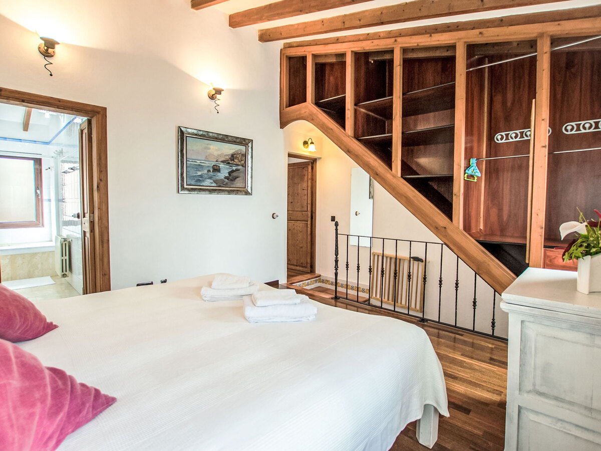À l'étage supérieur: chambre avec passage ouverte avec baie vitrée, fenêtre donnant sur la cour avec 1 lit double (180 cm, longueur 200 cm), air-conditionné et chauffage à air chaud.
