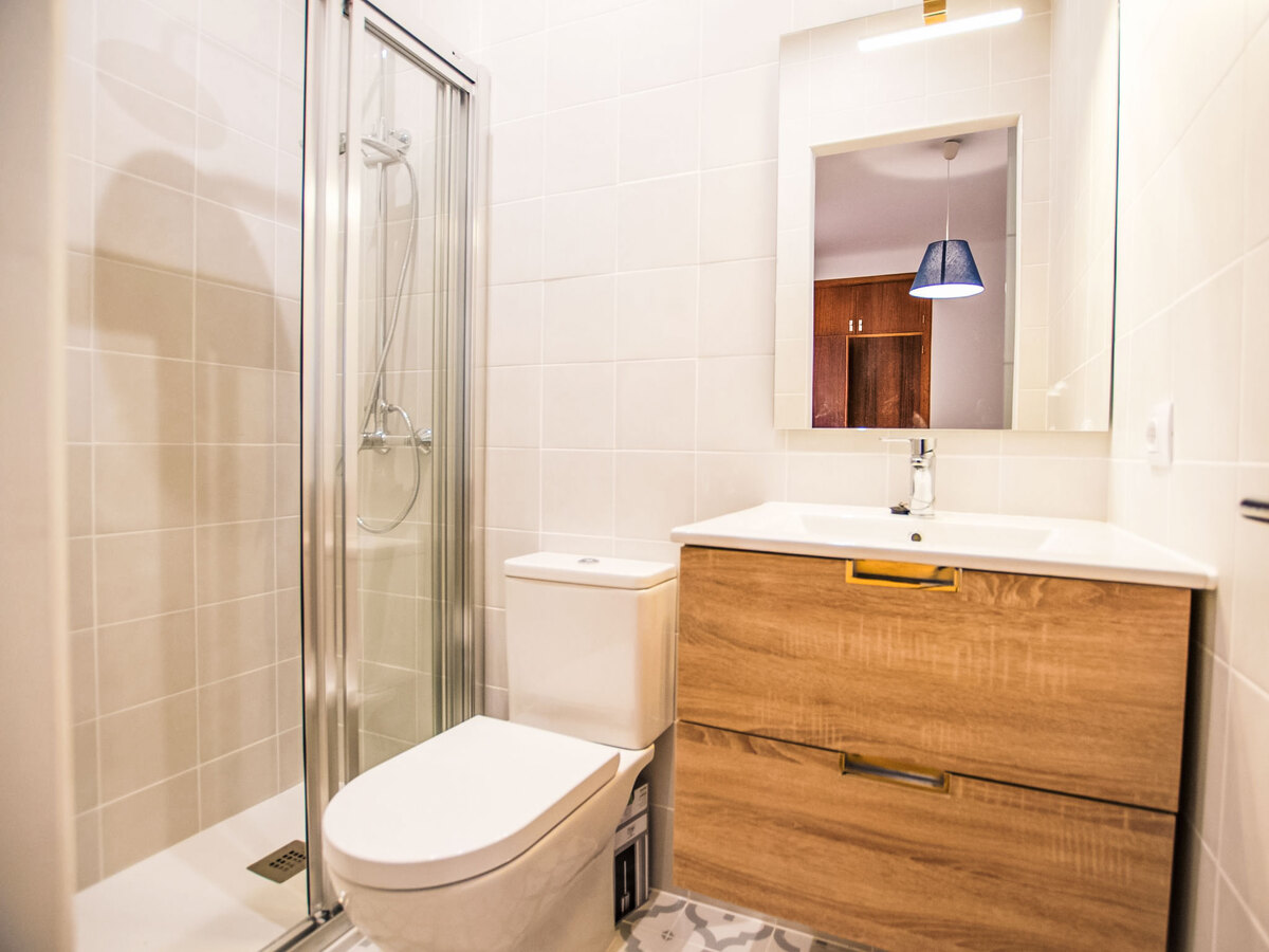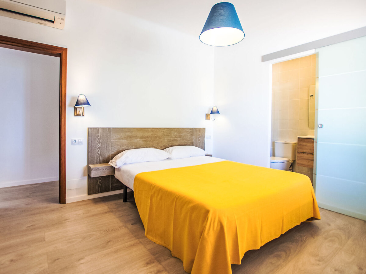 1 chambre double avec baie vitrée avec 1 grand-lit (150 cm, longueur 200 cm), bain/douche/WC, chauffage électrique, air-conditionné et chauffage à air chaud.