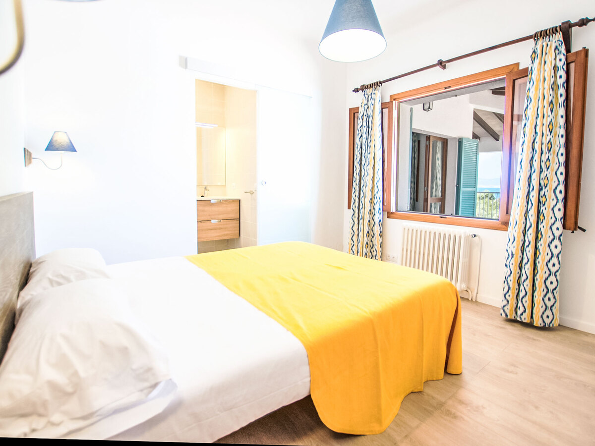 1 grande chambre double avec baie vitrée avec 1 grand-lit (150 cm, longueur 200 cm), bain/douche/WC, chauffage électrique, air-conditionné et chauffage à air chaud.