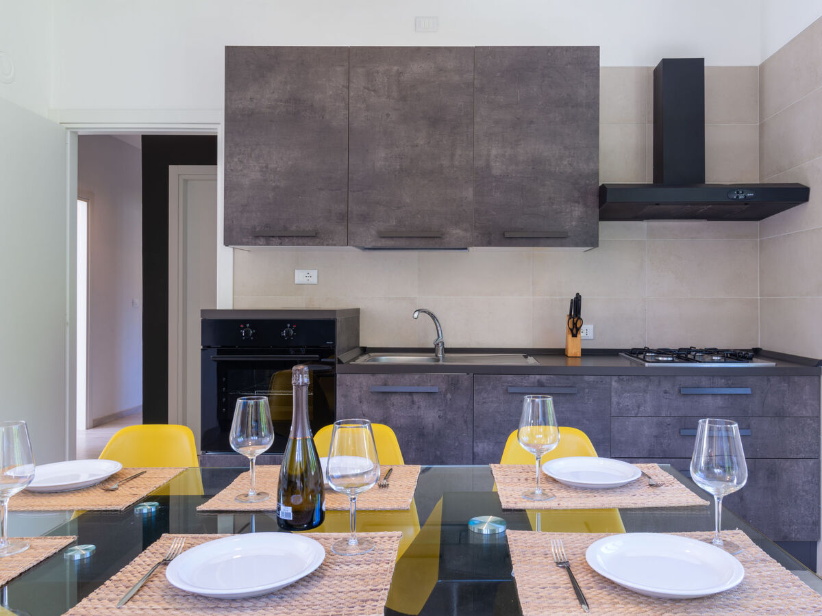 Cuisine ouverte (four, lave-vaisselle, 4 feux, grille-pain, bouilloire électrique, congélateur, cafetière électrique) avec table pour les repas.