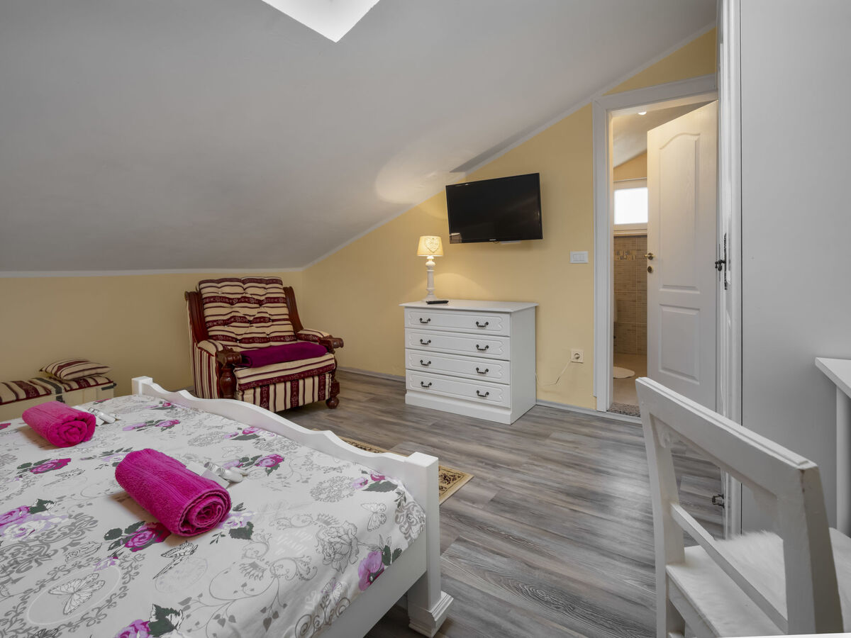 Sous le toit: 1 chambre, mansardée hauteur plafond 100 - 260 cm avec 1 grand-lit (160 cm, longueur 200 cm), TV (satellite) (écran plat).