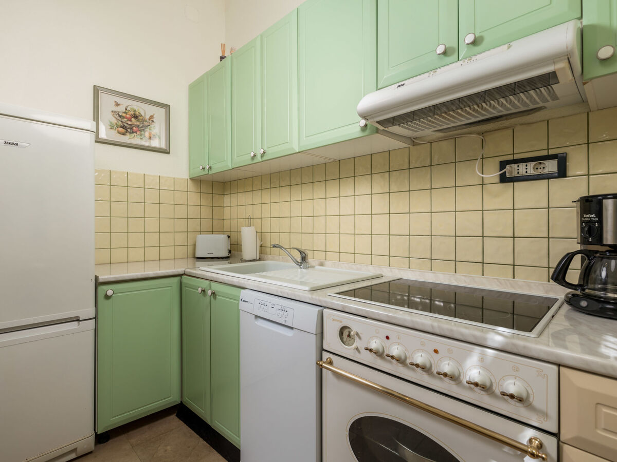 Cuisine (four, lave-vaisselle, 4 plaques vitrocéramiques, grille-pain, bouilloire électrique, congélateur, cafetière électrique) avec petite table pour les repas.