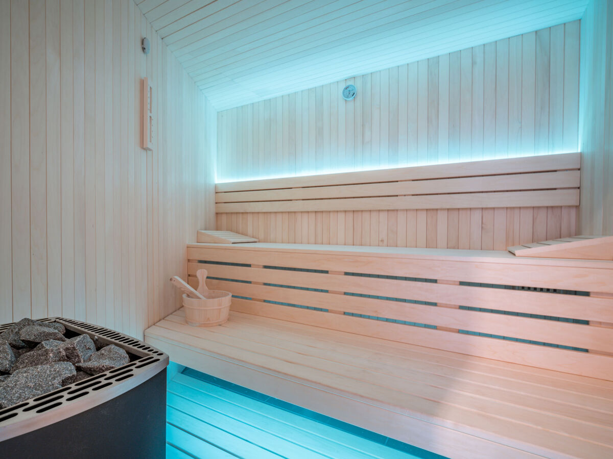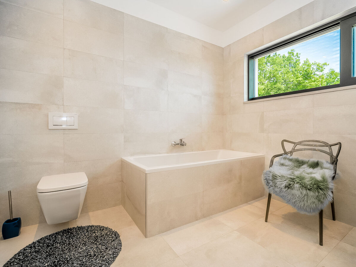 À l'étage supérieur: 2 chambres avec baie vitrée, chaque chambre avec: 1 grand-lit (180 cm, longueur 200 cm), douche/WC et TV (satellite) (écran plat).