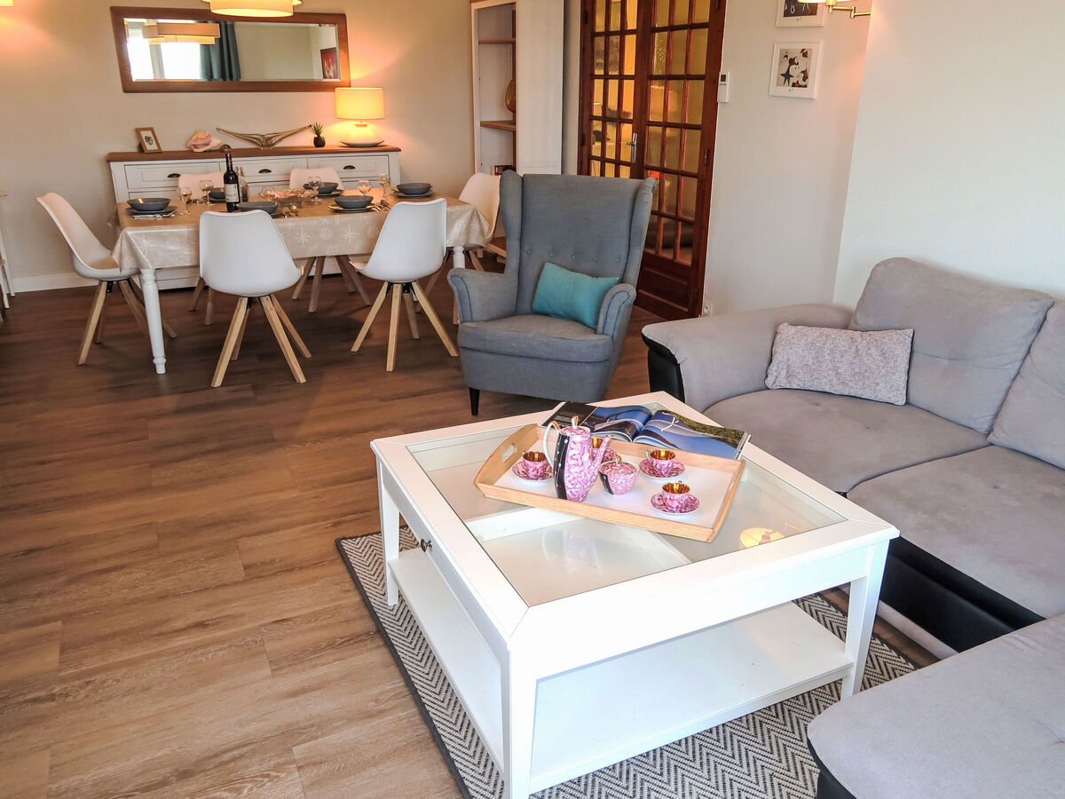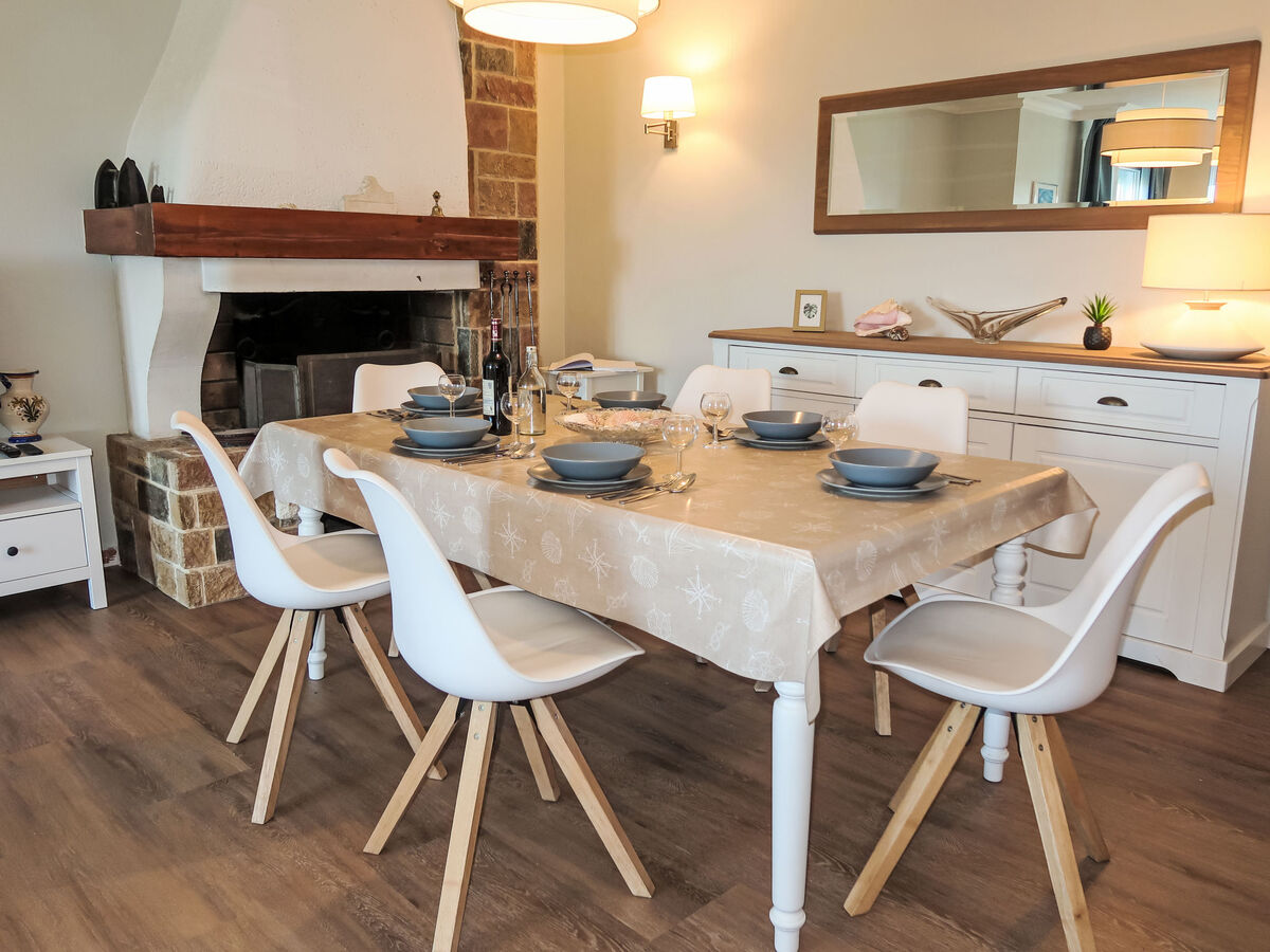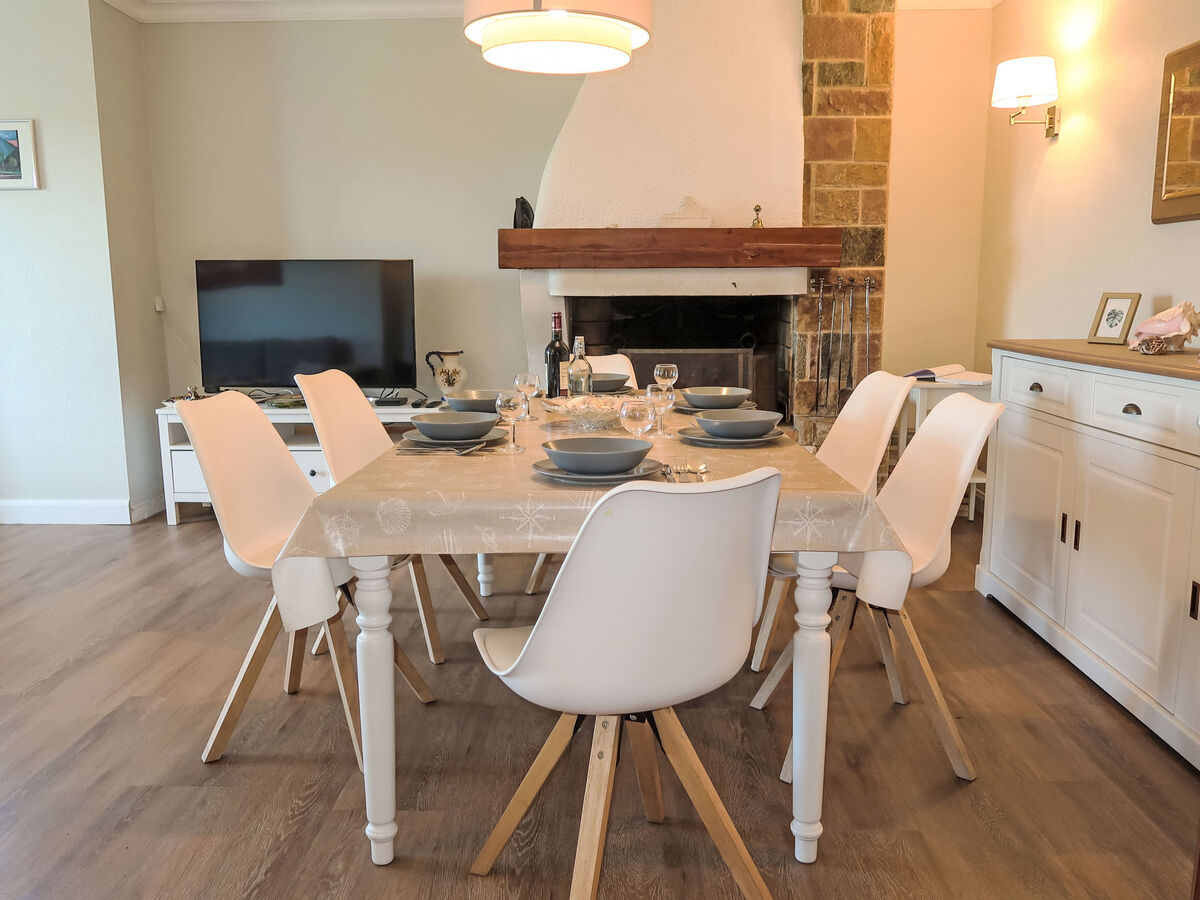 Clair, aménagement de bon goût: séjour/salle à manger avec cheminée, table pour les repas et TV (satellite).