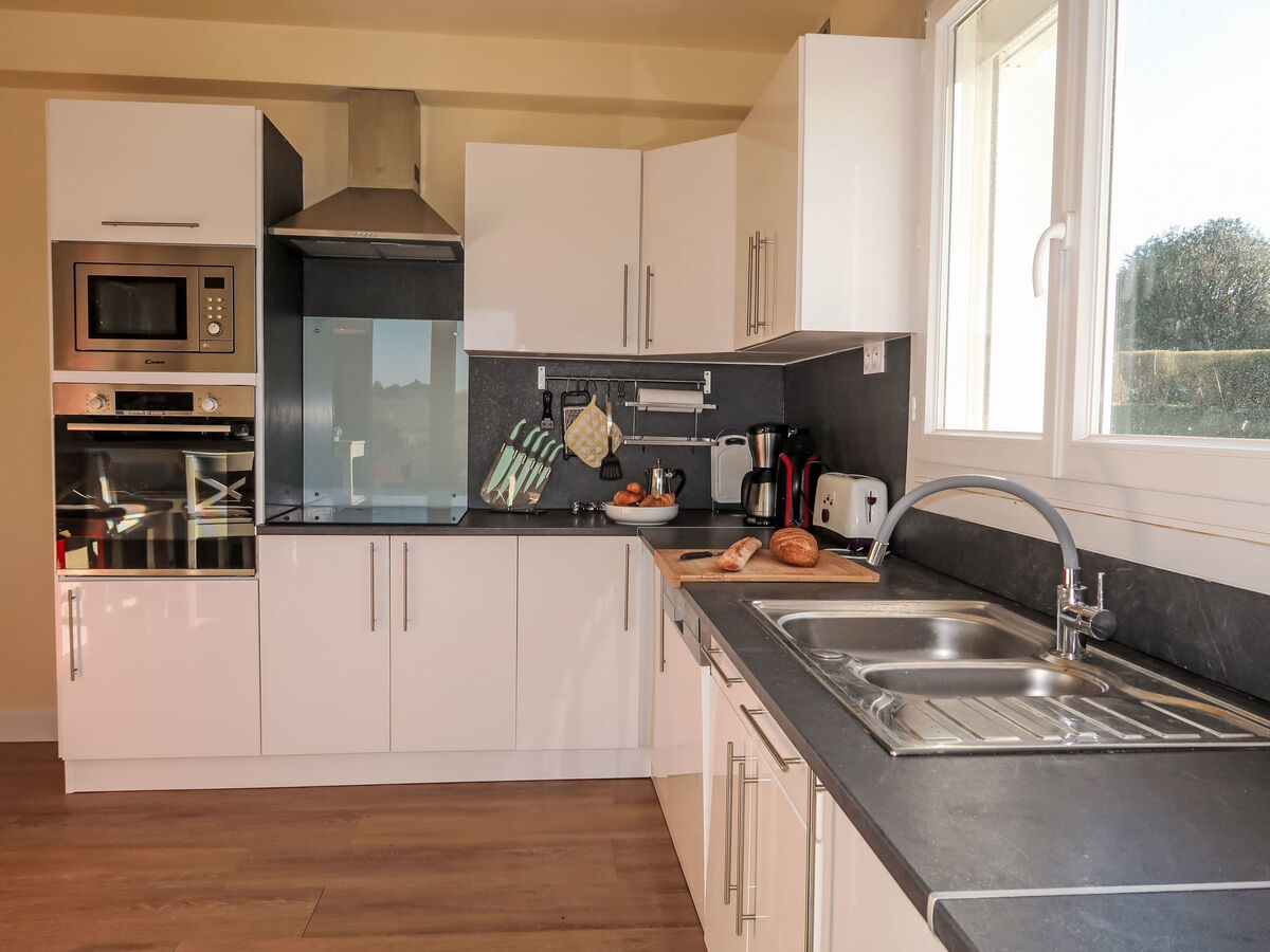 Cuisine (four, lave-vaisselle, 3 plaques vitrocéramiques, grille-pain, bouilloire électrique, micro-ondes, cafetière électrique) avec petite table pour les repas.