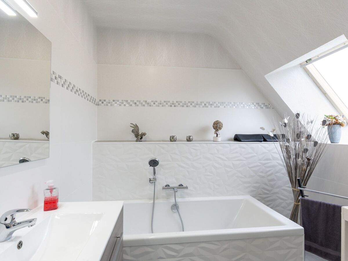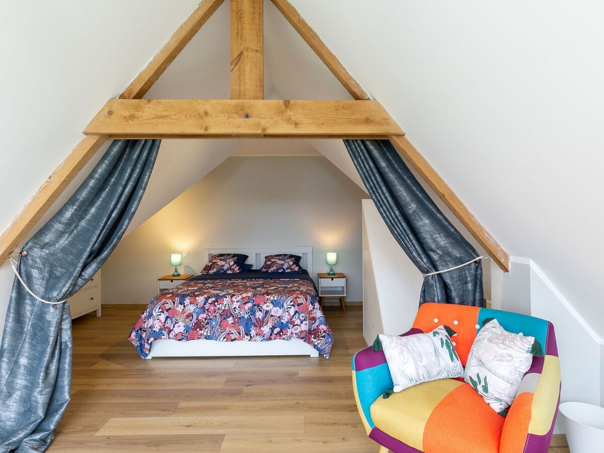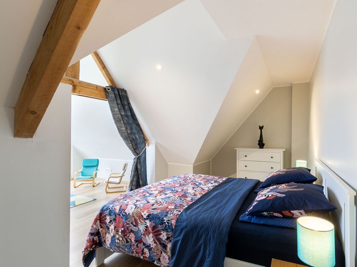 À l'étage supérieur: 1 grande chambre, mansardée avec baie vitrée avec 1 grand-lit (160 cm, longueur 200 cm).