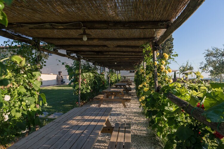 Derrière la maison, vous pourrez vous détendre sous la pergola couverte de roses parfumées, encadrée de vignes. Sous le portique, chaque appartement dispose d'un espace privé avec une table en bois, où prendre vos repas ou passer un peu de temps entre amis.
