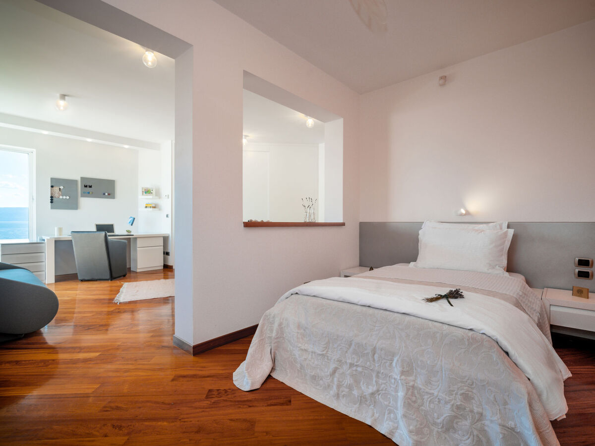 À l'étage supérieur: (escalier en colimaçon) 1 chambre 35 m2 avec 1 divan-lit double (160 cm, longueur 200 cm), 1 grand-lit (140 cm, longueur 200 cm), air-conditionné.