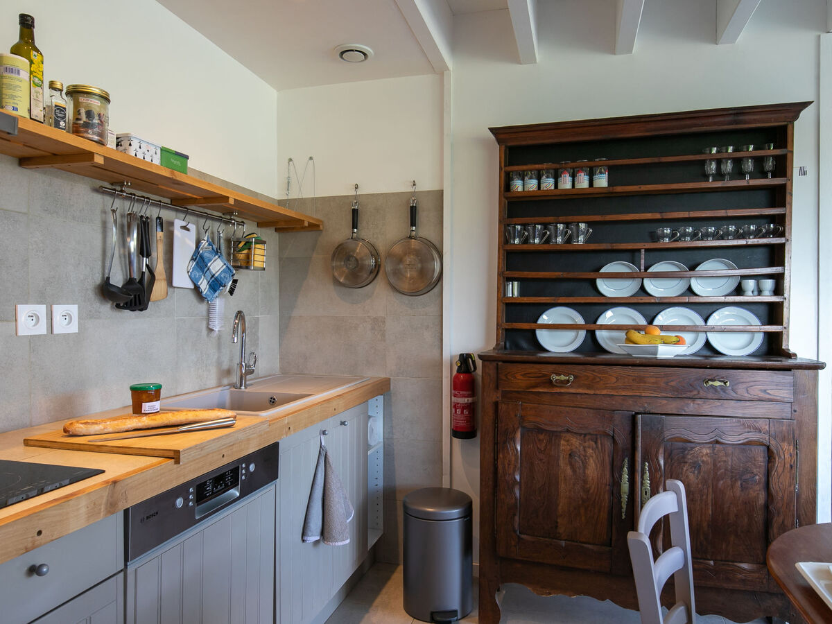 Cuisine ouverte (four, lave-vaisselle, 4 plaques à induction, micro-ondes, cafetière électrique, Capsules pour machine à café (Senseo) (NON INCLUSES)).