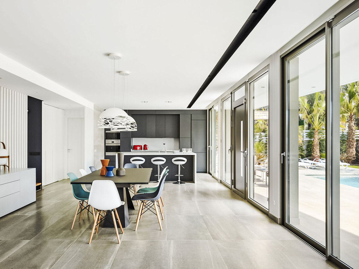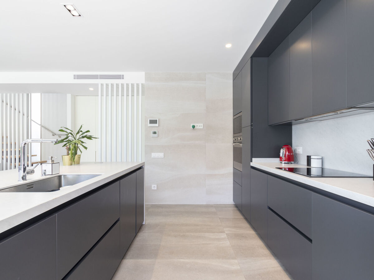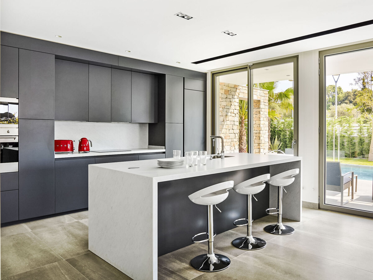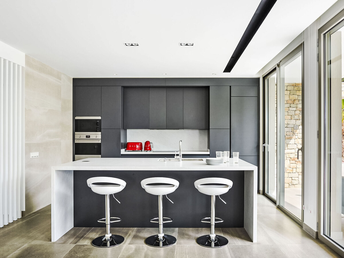 Cuisine ouverte (four, lave-vaisselle, 3 plaques à induction, micro-ondes, cafetière électrique) avec volet roulant électrique.
