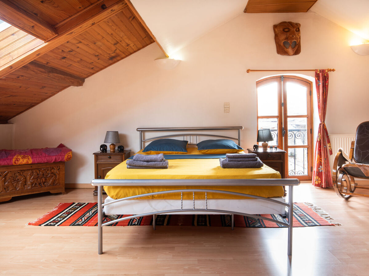 À l'étage supérieur: grande galerie mansardée, ouverte avec fenêtre sous le toit avec 1 grand-lit (180 cm, longueur 190 cm), TV (satellite).