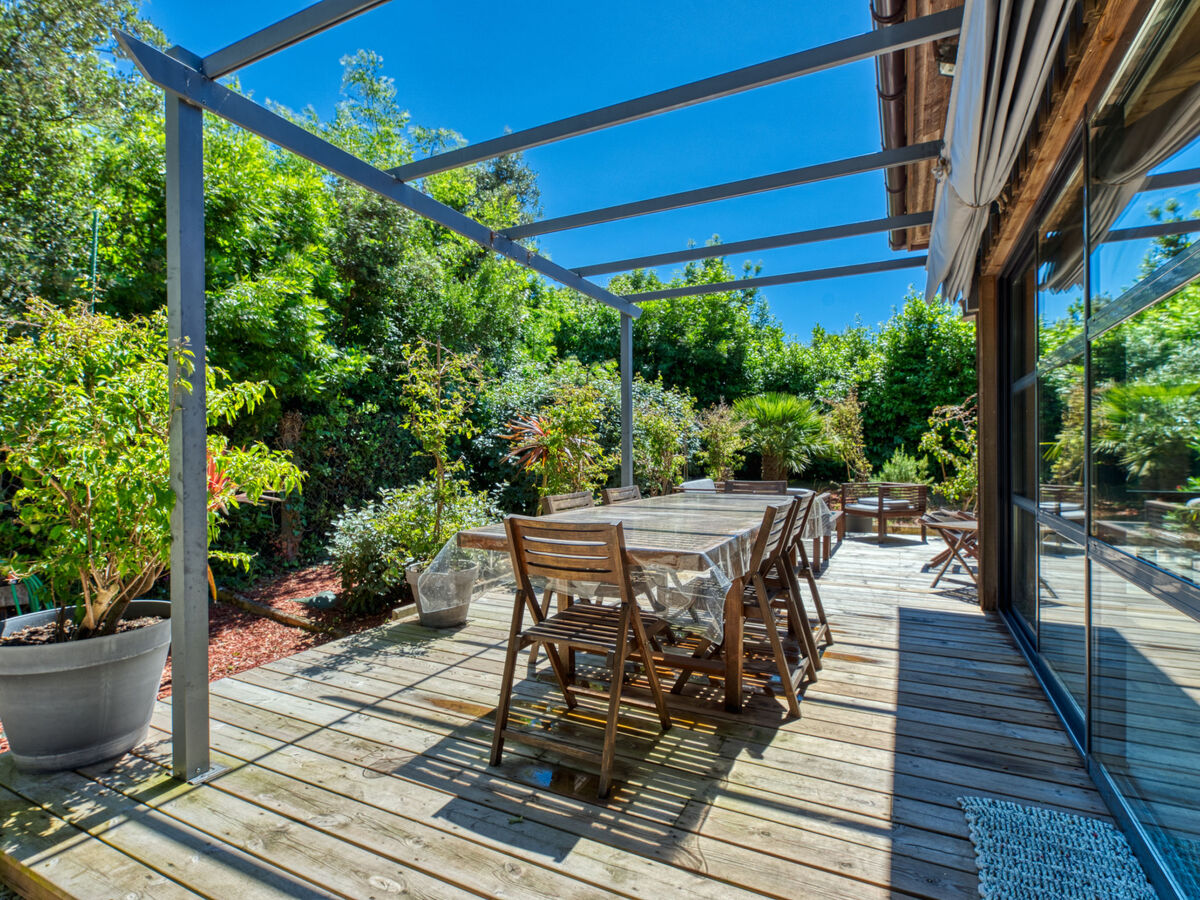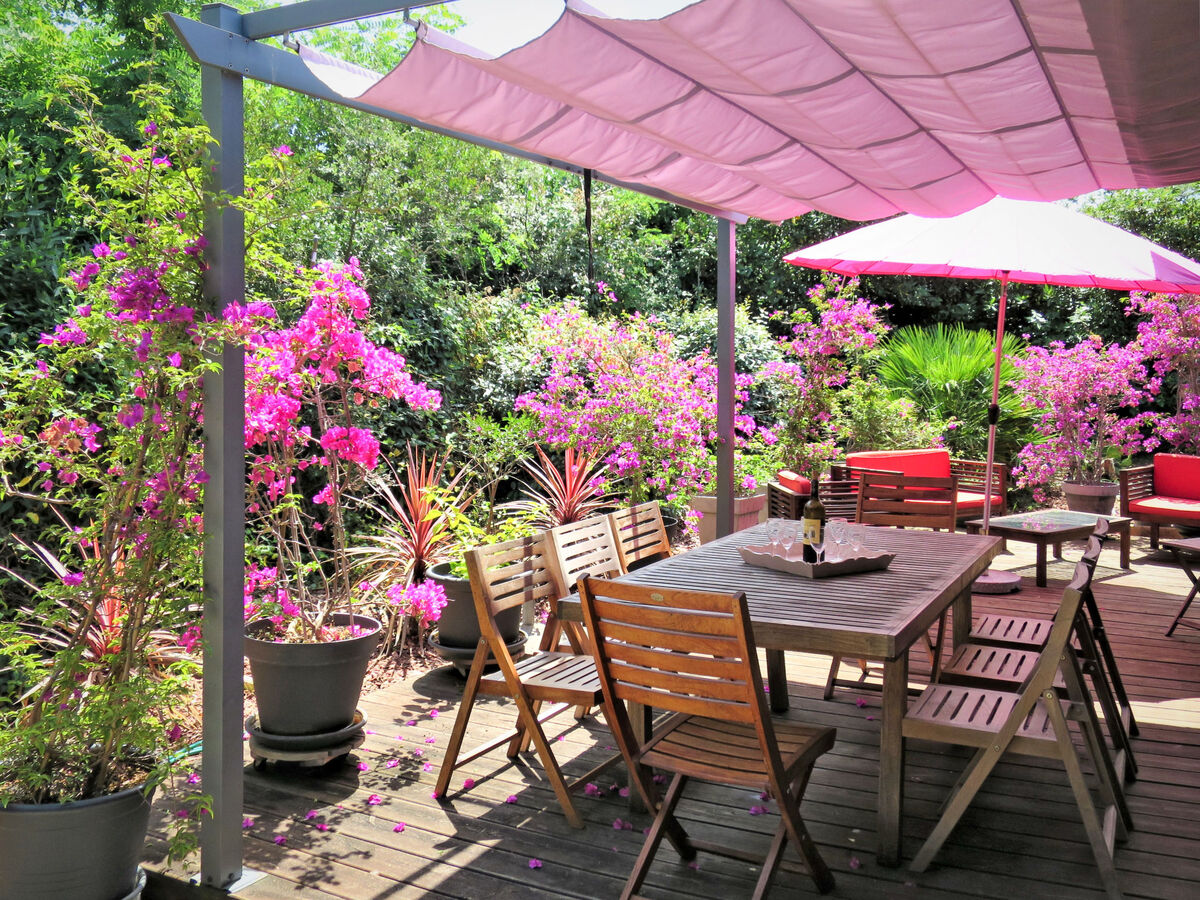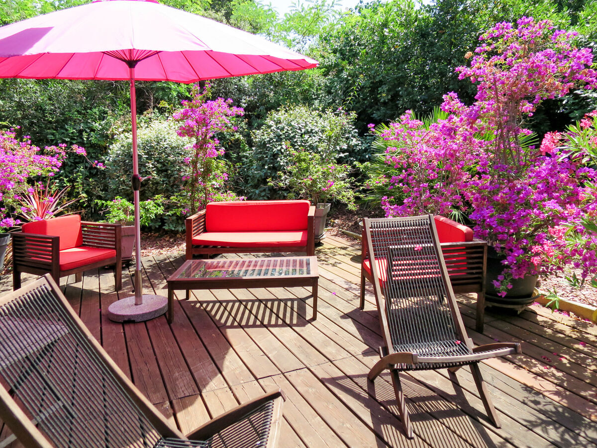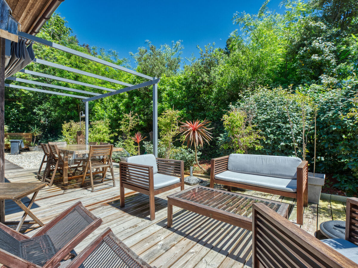 Meubles de terrasse, barbecue, chaises longues (2), réduit.