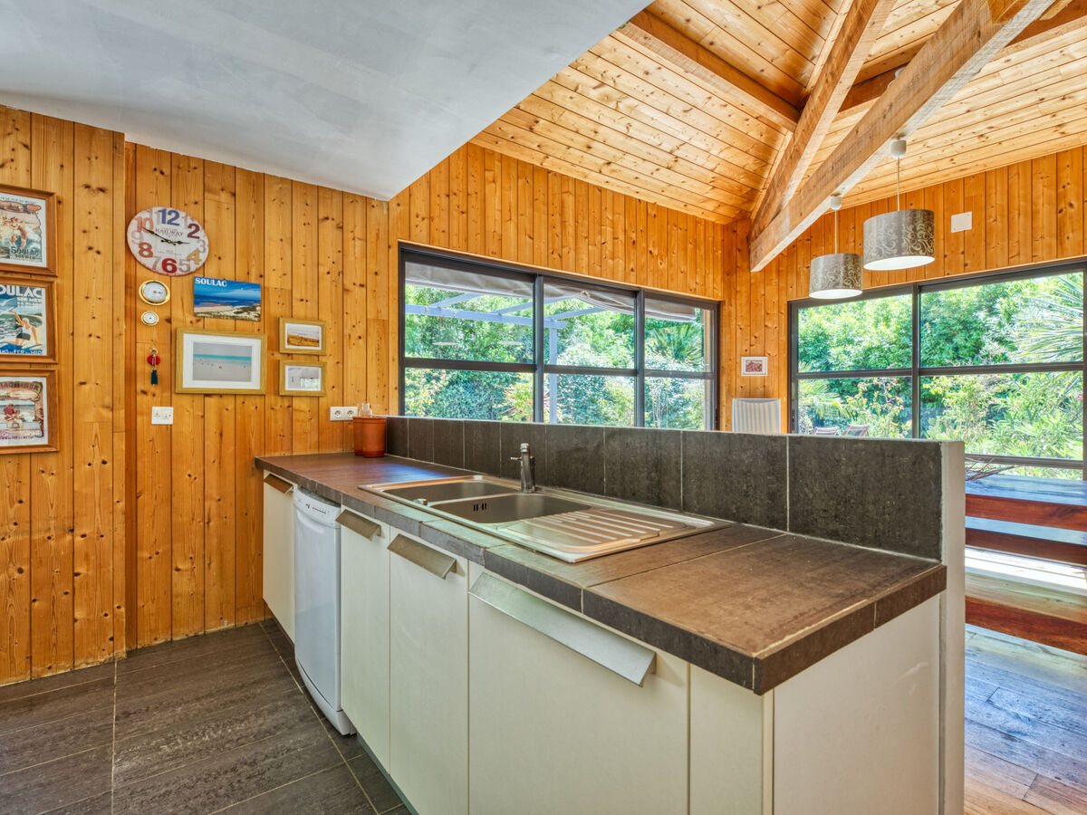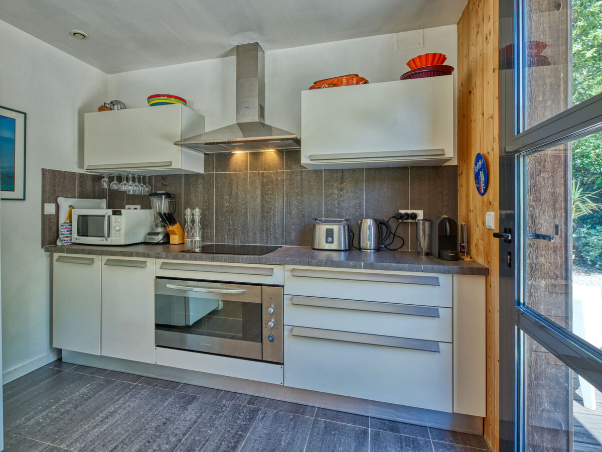 Cuisine ouverte (four, lave-vaisselle, 3 plaques à induction, grille-pain, bouilloire électrique, micro-ondes, congélateur, cafetière électrique, Capsules pour machine à café (Nespresso) (NON INCLUSES)) avec bar.