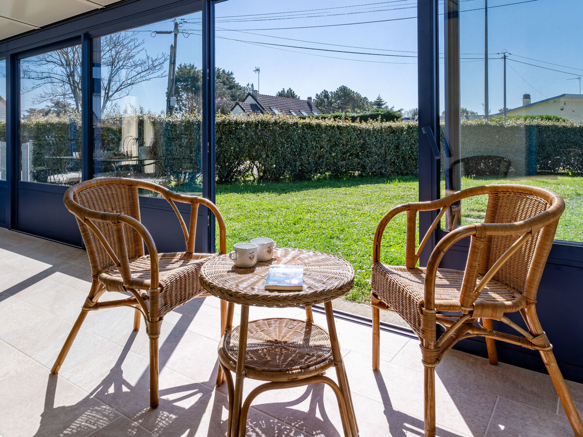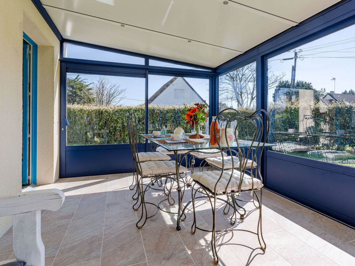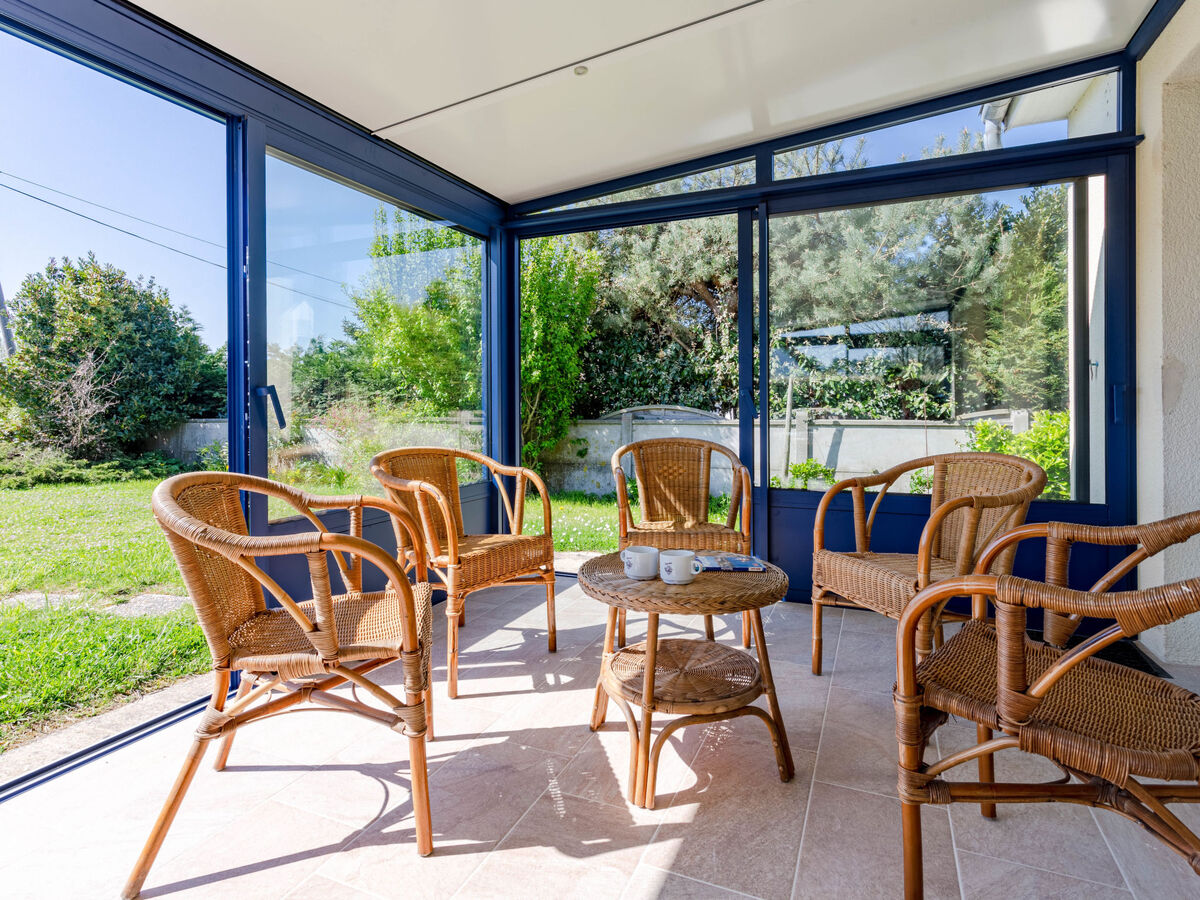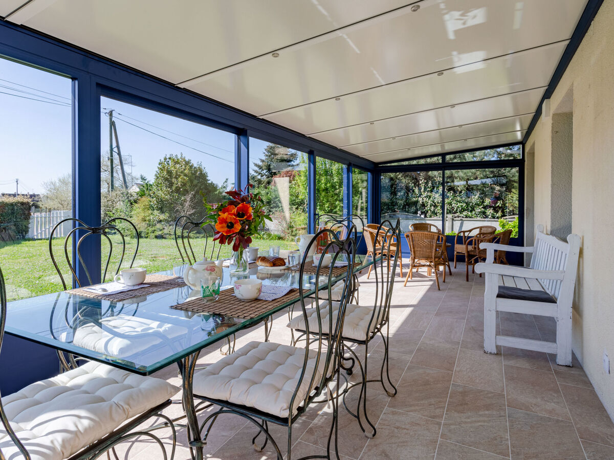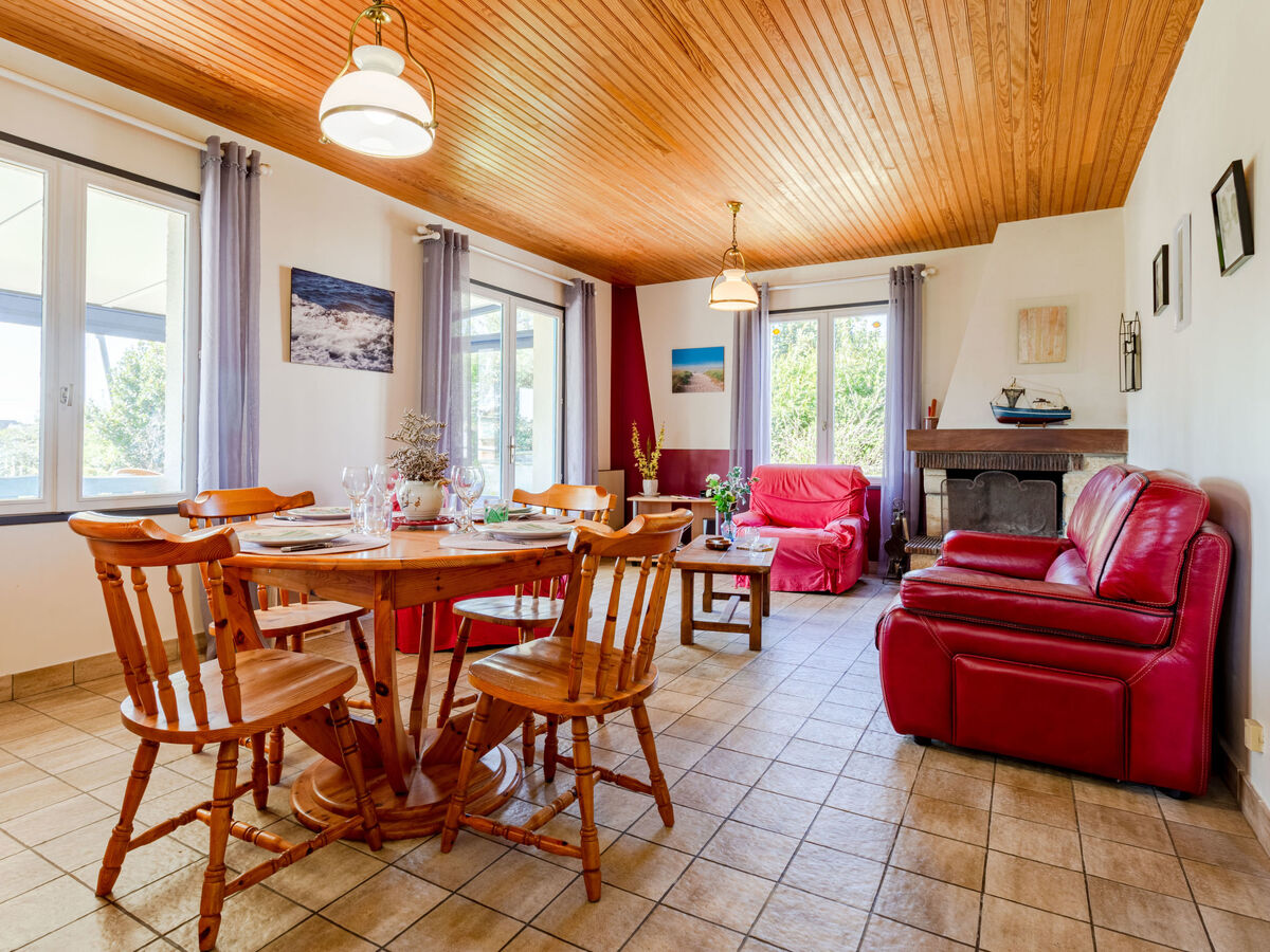 Aménagement fonctionnel: séjour/salle à manger avec véranda avec cheminée, table pour les repas et TV (satellite).