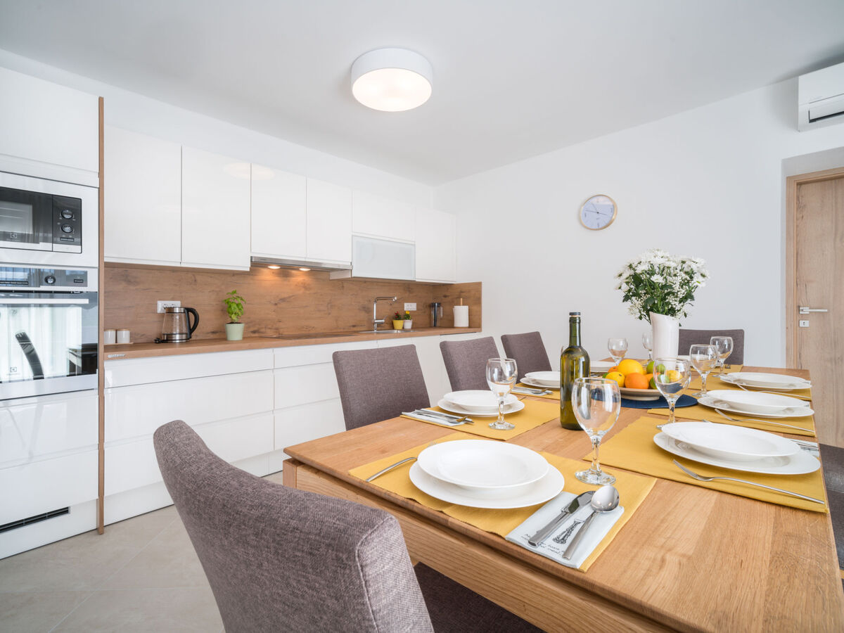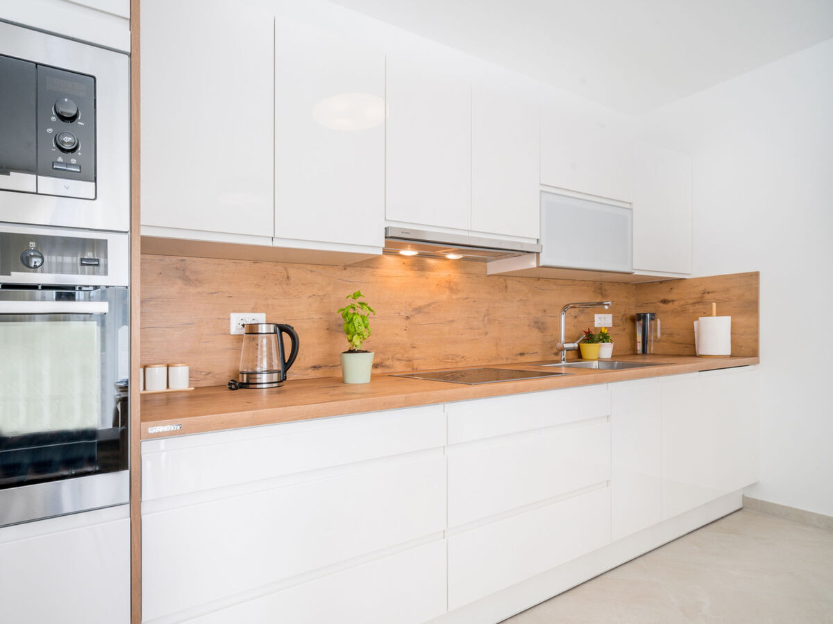 Cuisine ouverte (four, lave-vaisselle, 4 plaques vitrocéramiques, micro-ondes, congélateur, cafetière électrique) avec air-conditionné.