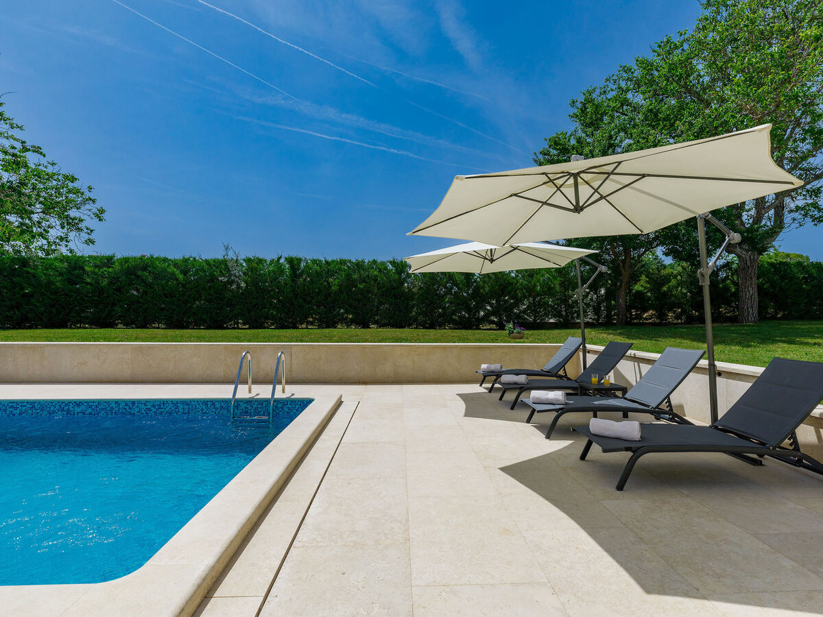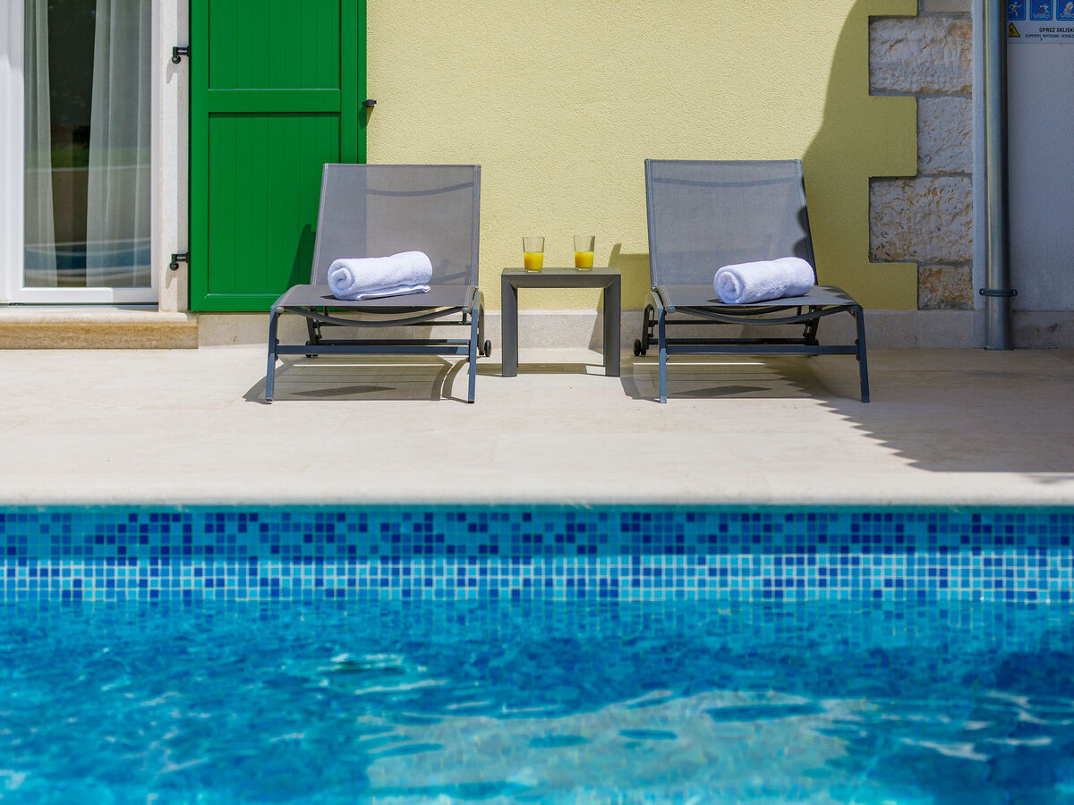 A usage privé: terrain 900 m2 (clôturé), jardin avec pelouse, piscine rectangulaire (8 x 4 m, profondeur 140 cm, disponibilité saisonnière: 01.Avr.