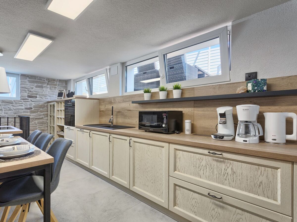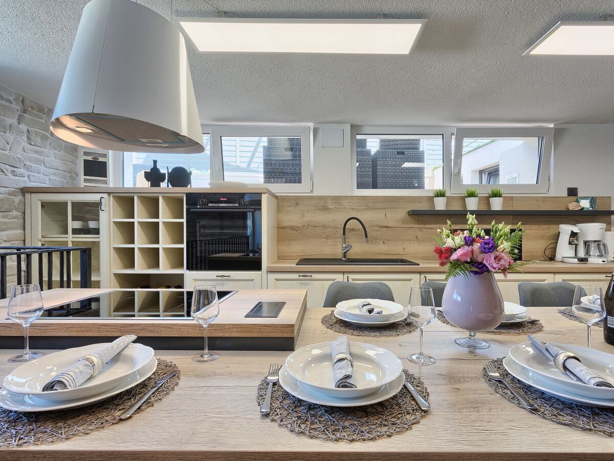 Cuisine ouverte (four, lave-vaisselle, 4 plaques vitrocéramiques, micro-ondes, congélateur, cafetière électrique).