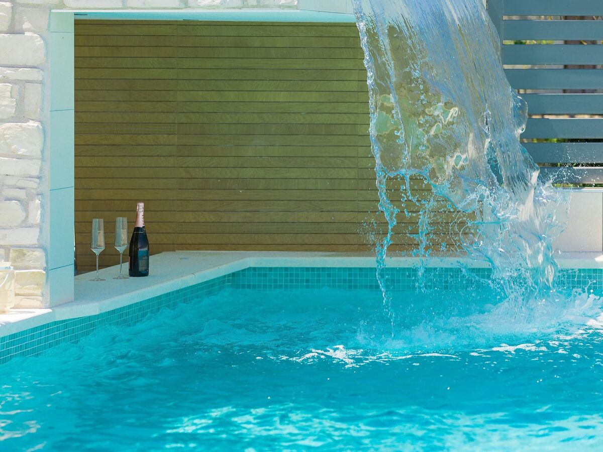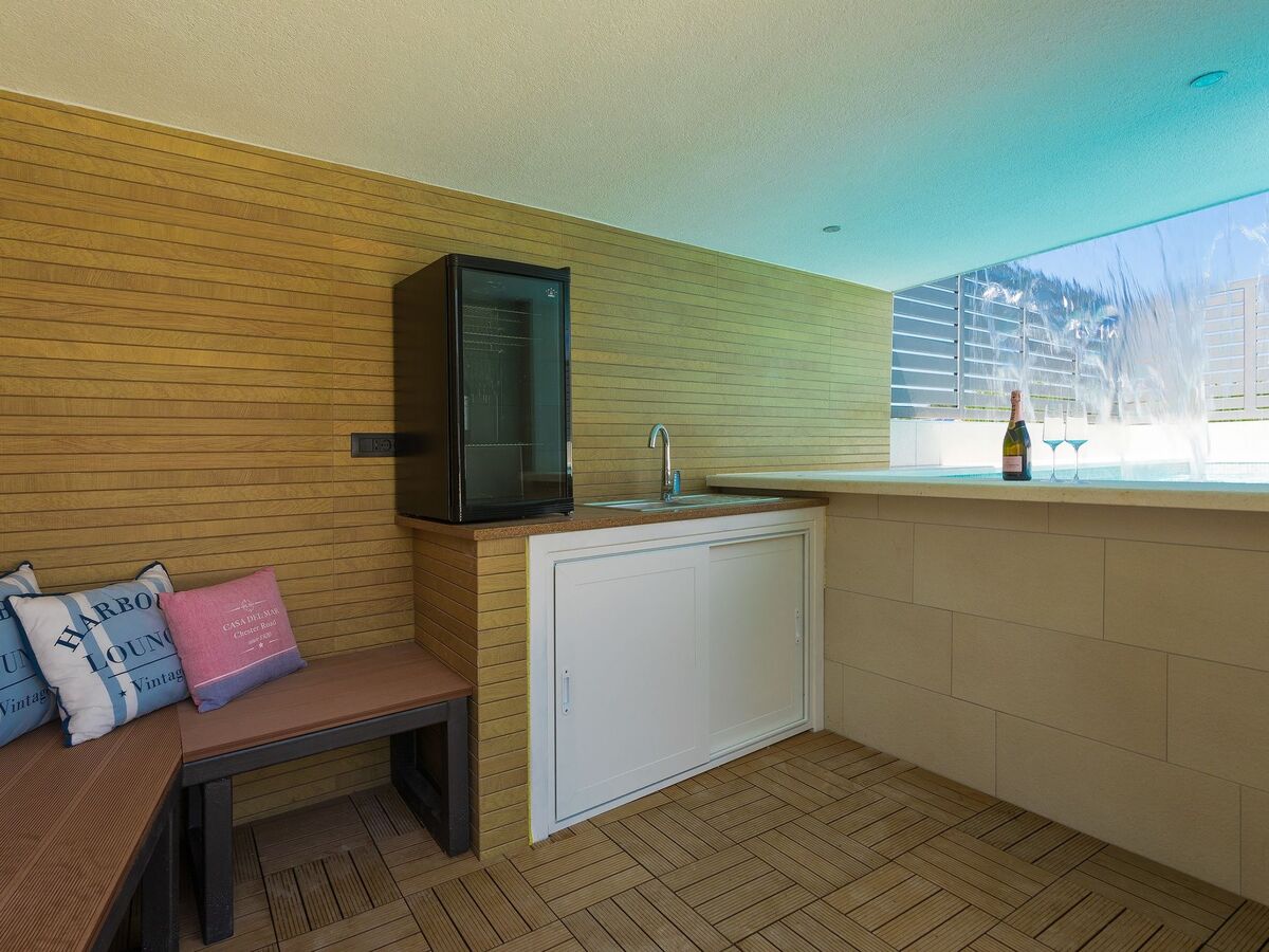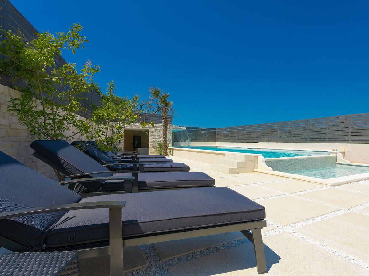 Bassin pour les enfants, douche extérieure, terrasse (20 m2), meubles de jardin.