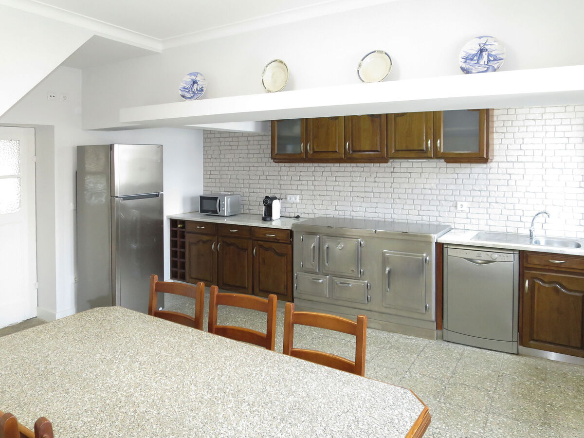 Cuisine (four, lave-vaisselle, 4 feux, bouilloire électrique, micro-ondes, congélateur, cafetière électrique) avec table pour les repas.