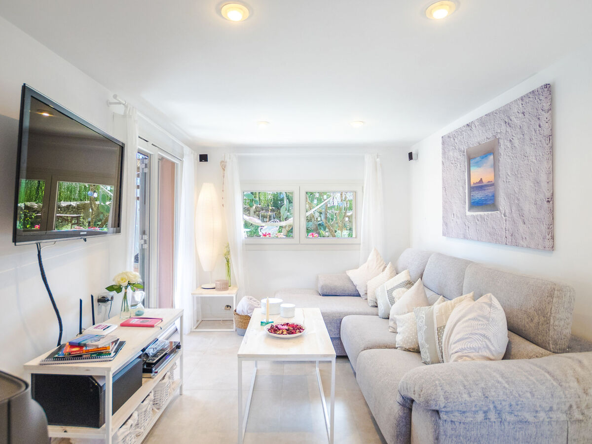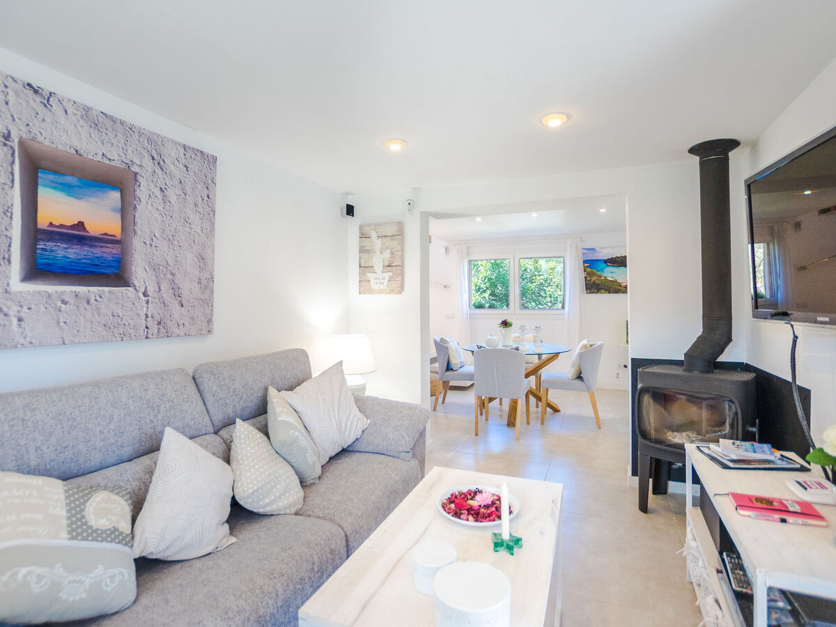 Complètement rénovée, aménagement très plaisant et romantique: séjour/salle à manger ouvert avec porte coulissante, baie vitrée avec cheminée, TV, chaînes de TV internationales, écran plat, air-conditionné et chauffage à air chaud.