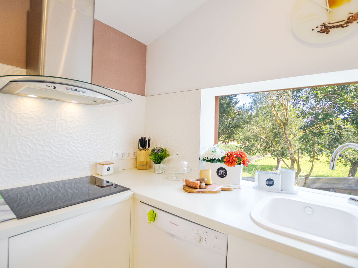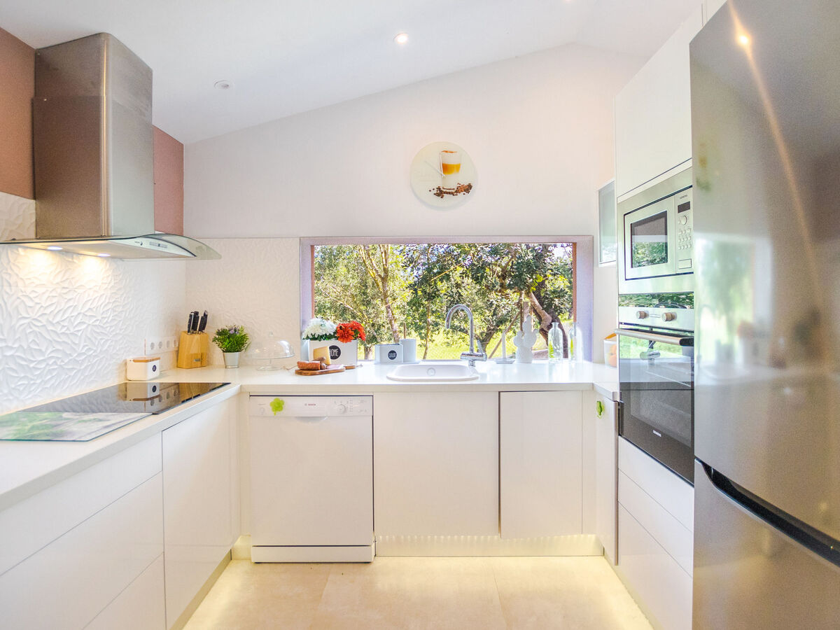 Cuisine ouverte (four, lave-vaisselle, 3 plaques vitrocéramiques, grille-pain, bouilloire électrique, micro-ondes, congélateur, cafetière électrique).