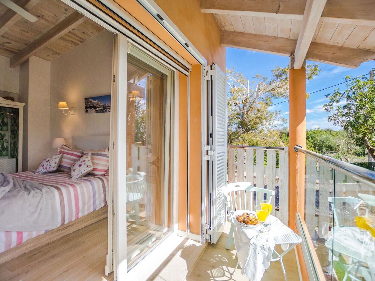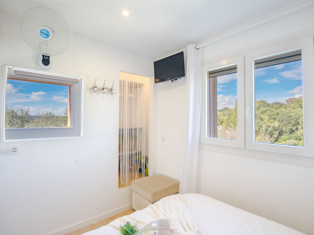 1 chambre double avec baie vitrée avec 1 grand-lit (135 cm), ventilateur.