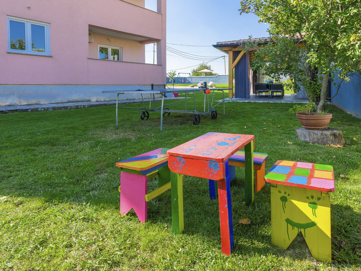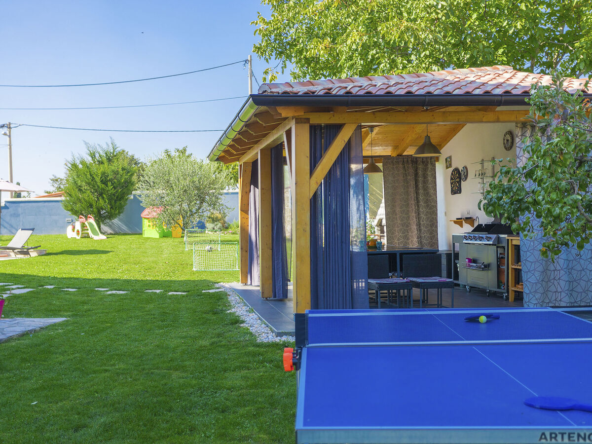 Douche extérieure, ping-pong, terrasse (40 m2), meubles de jardin, barbecue, espace de jeux pour les enfants (toboggan, balançoire).
