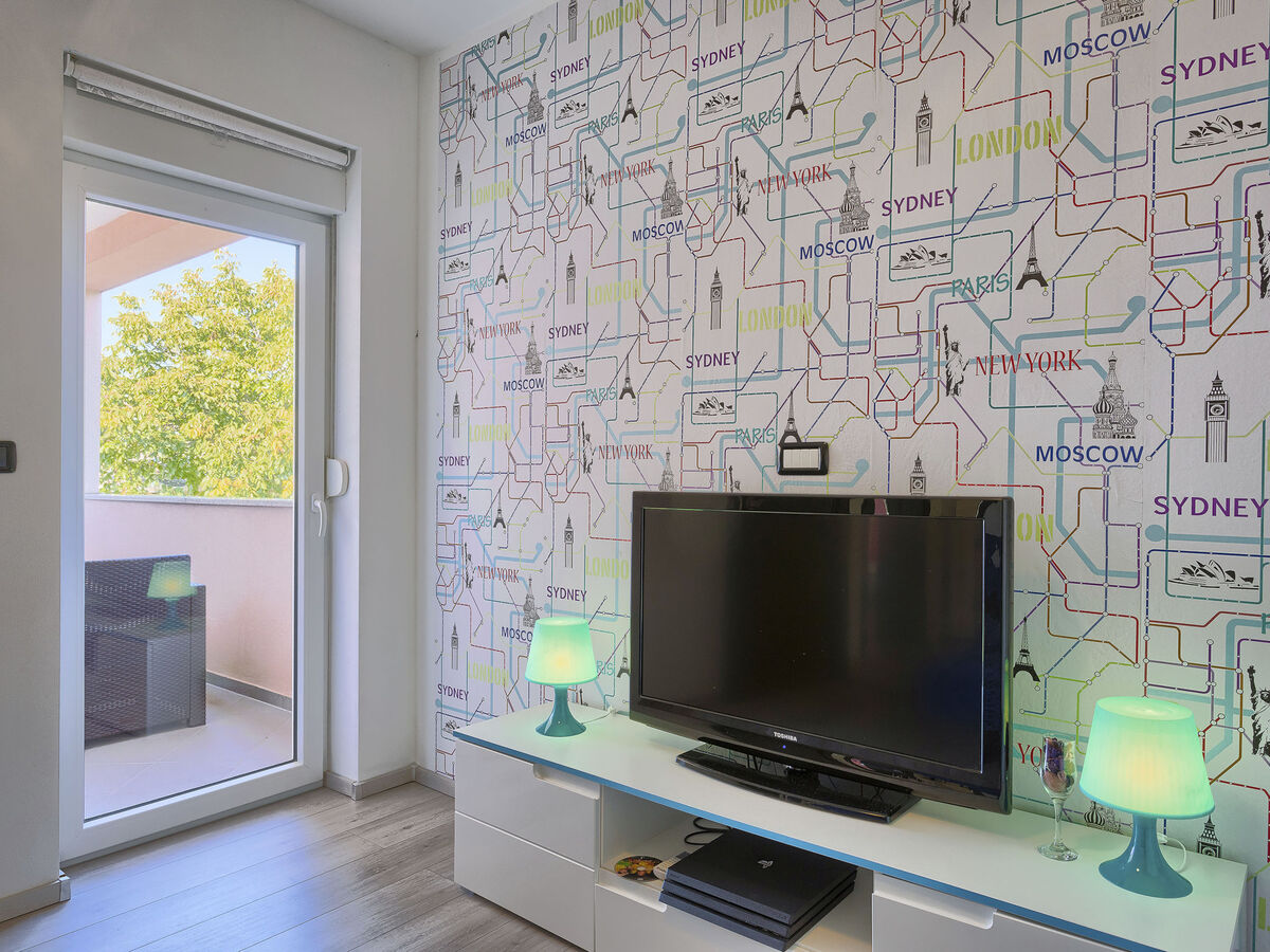 1 chambre avec 1 divan-lit double (140 cm, longueur 200 cm), TV (écran plat).