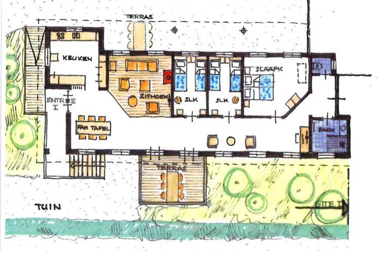 Rez-de-chaussée: (Salle de séjour(TV(chaînes de télévision néerlandaises, chaînes de télévision internationales), poêle(bois), coin salon), salle à manger, cuisine(plaque de cuisson, cafetière/percolateur, four, lave-vaisselle ), chambre(Lit double ou 2 x lit simple), chambre(2x lit simple), chambre(2x lit simple)) salle de bains(douche), WC, lave-linge , chauffage(électrique), cour(privé), terrasse(privé), jardin(clôturé), piscine(partagé avec d'autres clients, 9 x 4 m., ouvert de Mai jusqu'à (inclus) Sept)
